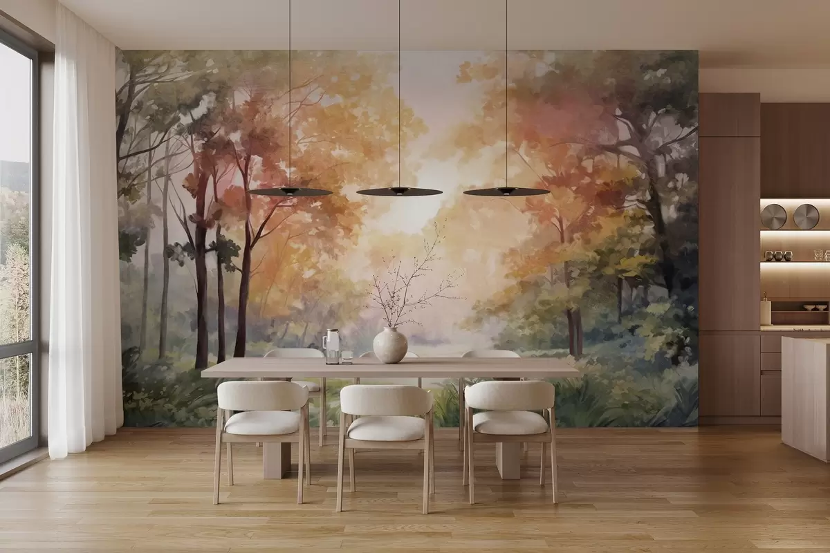 Fototapetai Tekstūruotas miško kraštovaizdis, medžiai su oranžiniais ir žaliais lapais, pastelinių spalvų paletė Nr. w09210v1