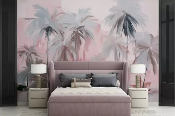 Fototapetai Abstrakčios minimalistinės pastelinės atogrąžų palmės prislopintų rausvų ir pilkų atspalvių fone Nr. w09212v1