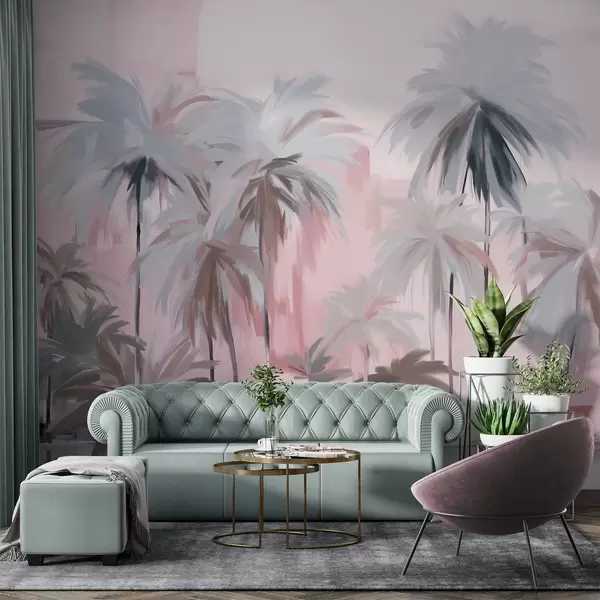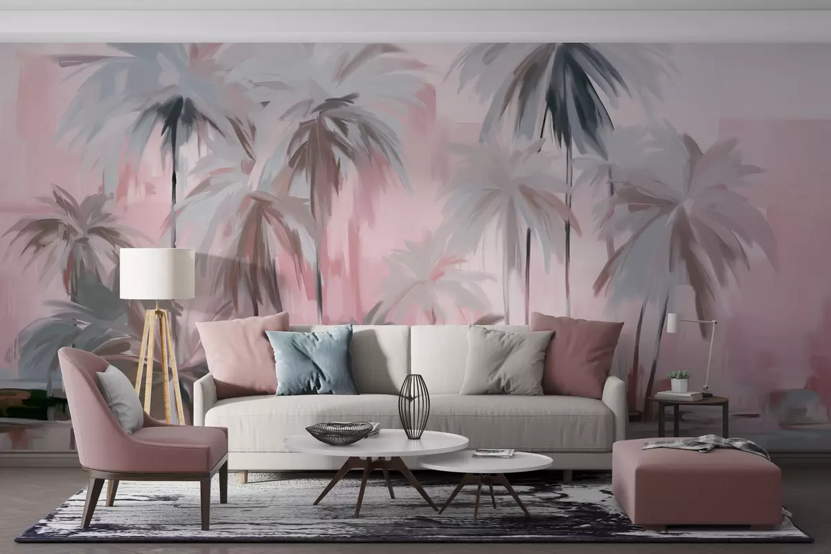Fototapetai Abstrakčios minimalistinės pastelinės atogrąžų palmės prislopintų rausvų ir pilkų atspalvių fone Nr. w09212v1