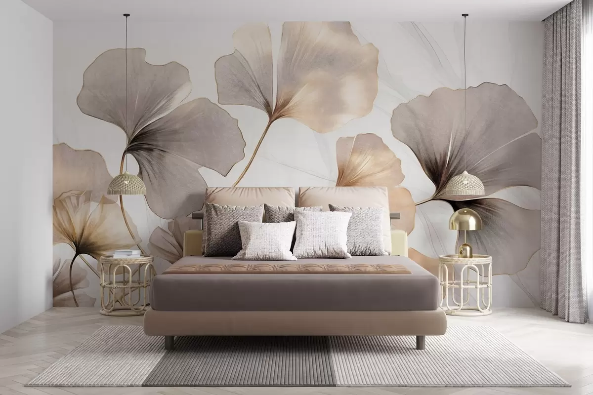 Fototapetai Smėlio, geltonos ir rudos spalvos ginkmedžio lapai, švelnios tekstūros akvarelės efektas, šviesus fonas Nr. w09215