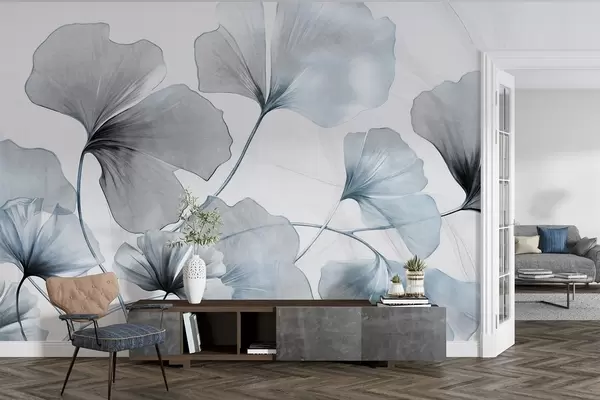 Fototapetai Prislopintų mėlynų ir pilkų atspalvių ginkmedžio lapai, švelnios tekstūros akvarelės efektas, šviesus fonas Nr. w09215v1