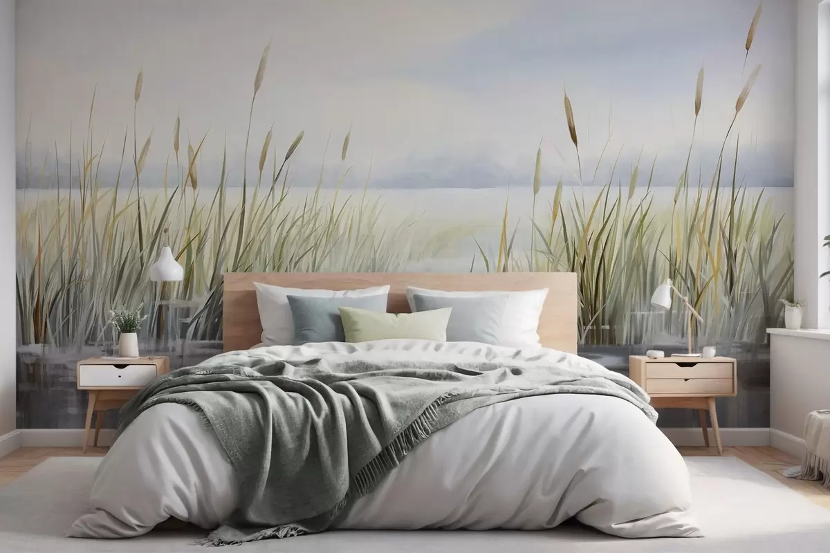 Fototapetai Akvarelės tekstūros paveikslas, imituojantis kraštovaizdį su ežeru, žole, debesuotu dangumi ir neryškiu fonu Nr. w09219