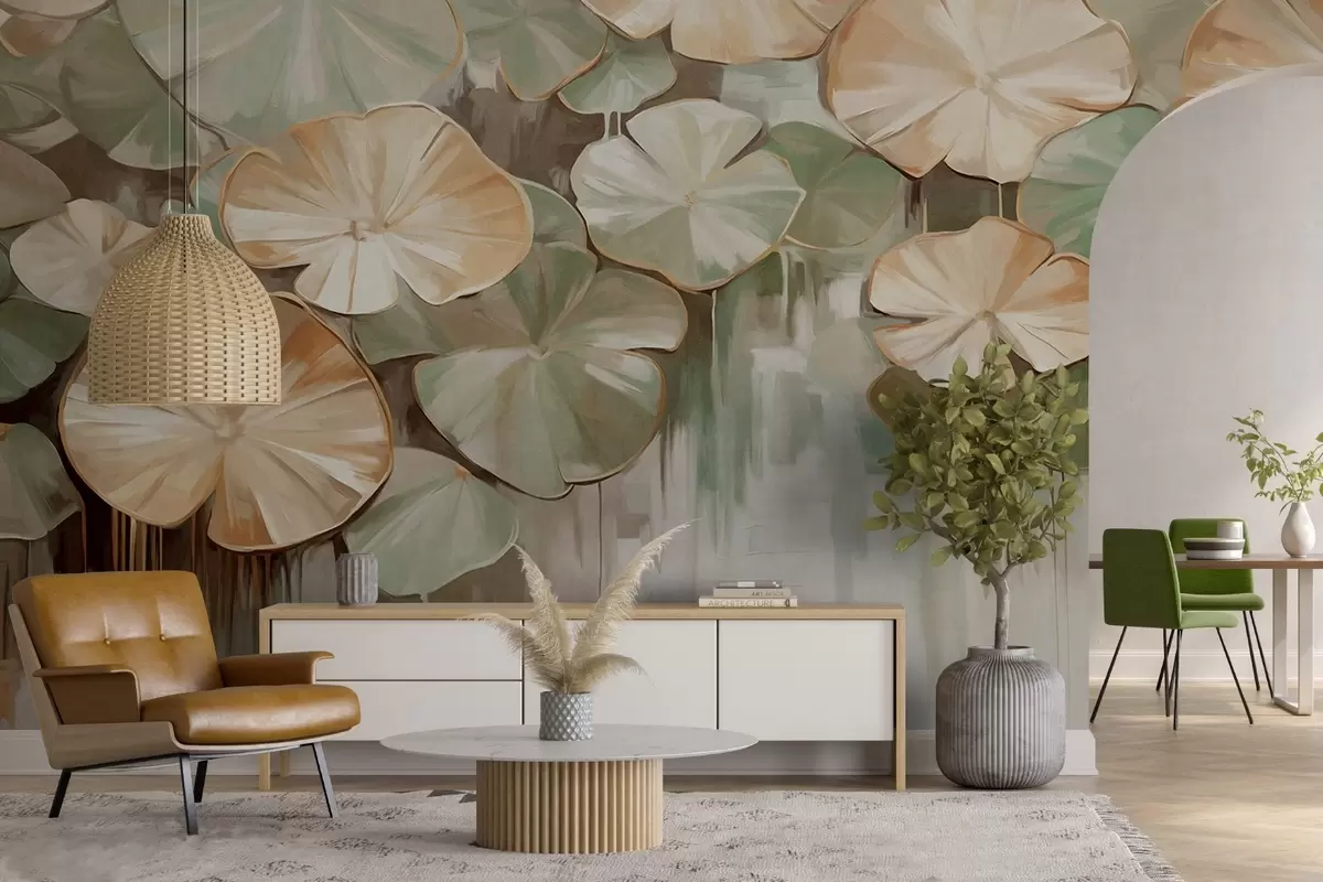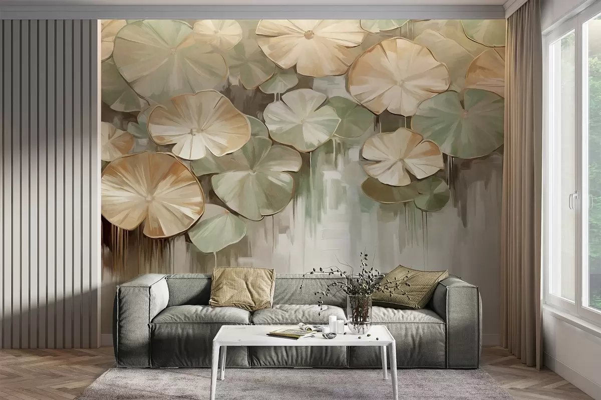 Fototapetai Tvenkinyje esančios žalios ir smėlio spalvos tekstūrinės lelijų pagalvėlės, fonas - neryškus baltos, žalios ir rudos spalvų mišinys Nr. w09255