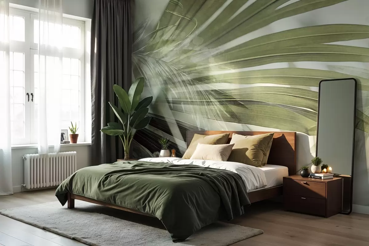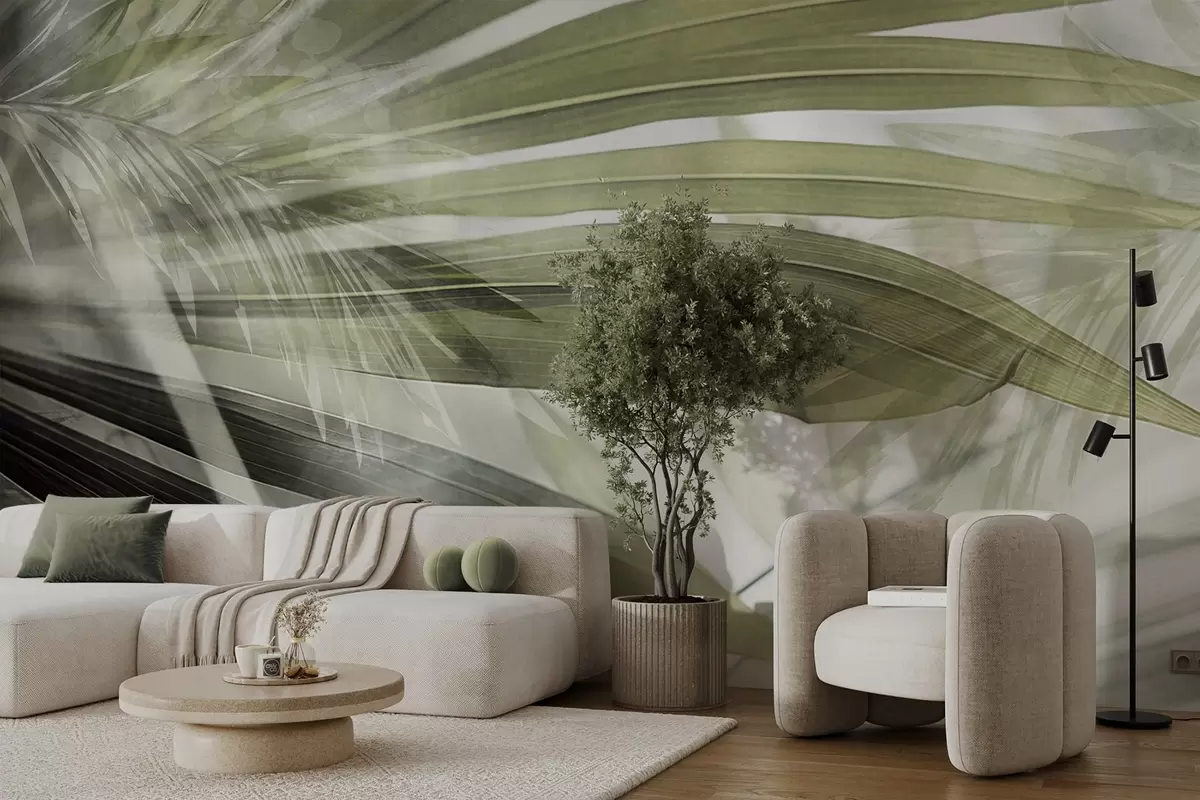 Fototapetai Šviesiai žalio atspalvio palmių lapai, persidengiantys vienas per kitą ir sukuriantys sluoksniuotą efektą, švelniame neutraliame fone Nr. w09256v1