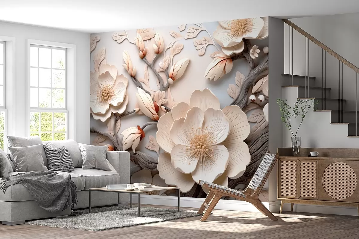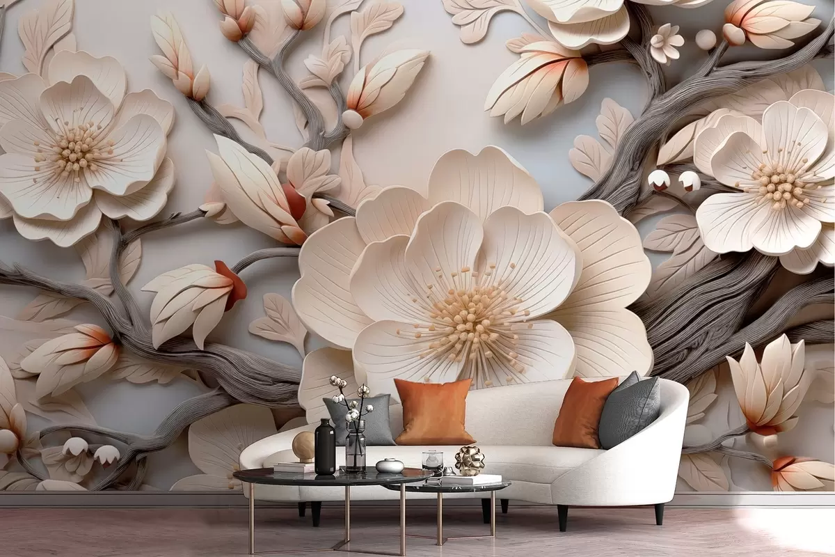 Fototapetai Šviesių tonų tūrinės gėlės ir šakos Nr. w09272