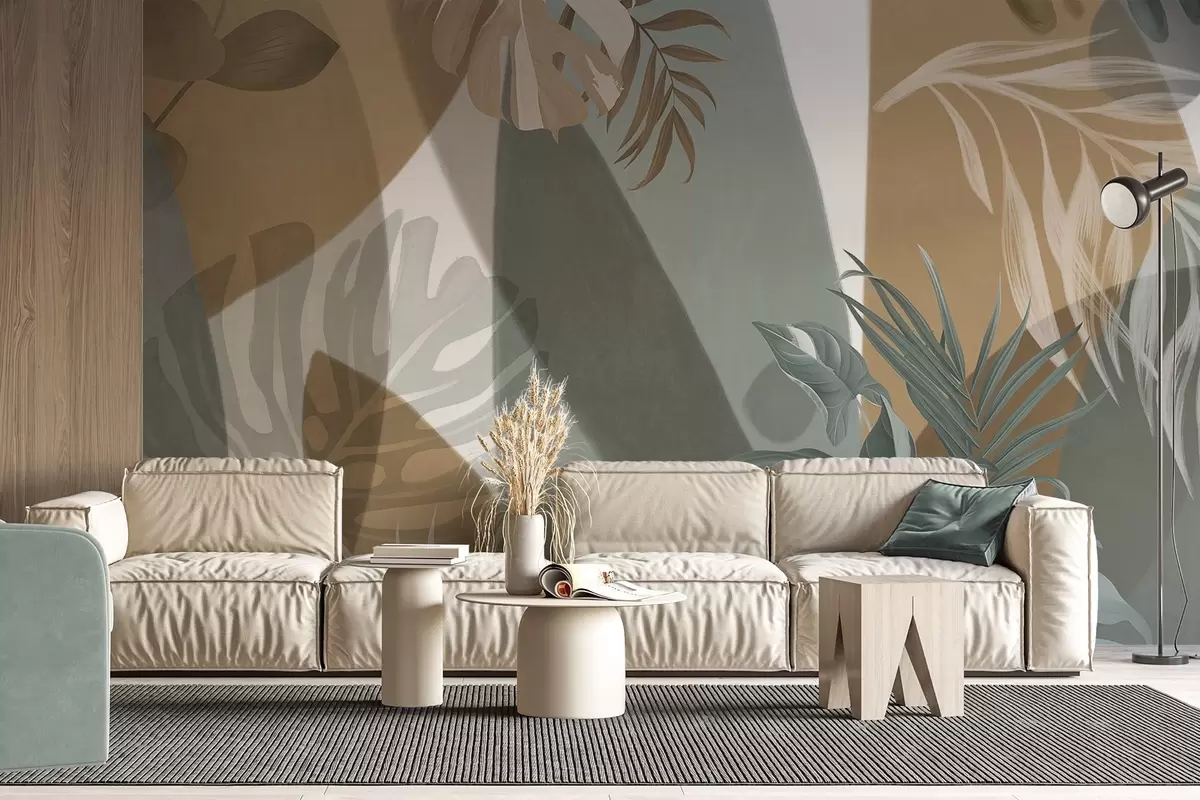 Fototapetai Monsteros lapai ir palmių lapai, rudos, baltos ir žalios spalvų raštas, atogrąžų nuotaika, abstrakčios formos, dekoratyvinis Nr. w09288