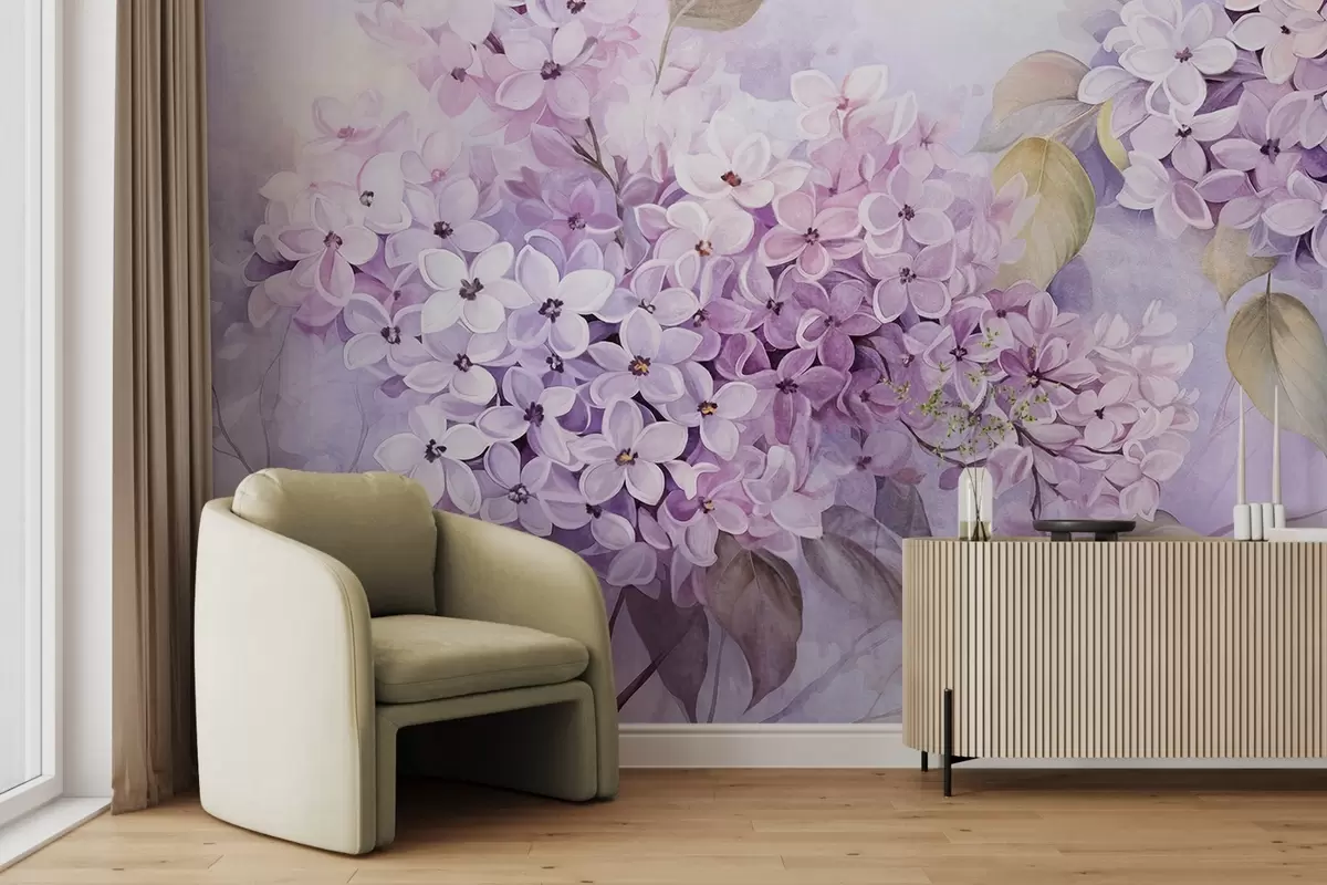 Fototapetai Lelijų tekstūros gėlės su šviesiai violetiniais žiedlapiais, šviesiai žali lapai, akvarelės stilius, švelnios, pastelinės spalvos, subtilūs potėpiai teptuku Nr. w09291