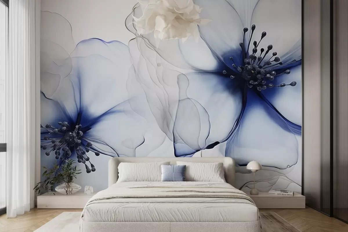 Fototapetai Dvi permatomos tekstūros mėlynos spalvos gėlės su matomais erškėtrožėmis, persidengiančiais subtiliais žiedlapiais ir švelnia tekančia tekstūra Nr. w09295v1