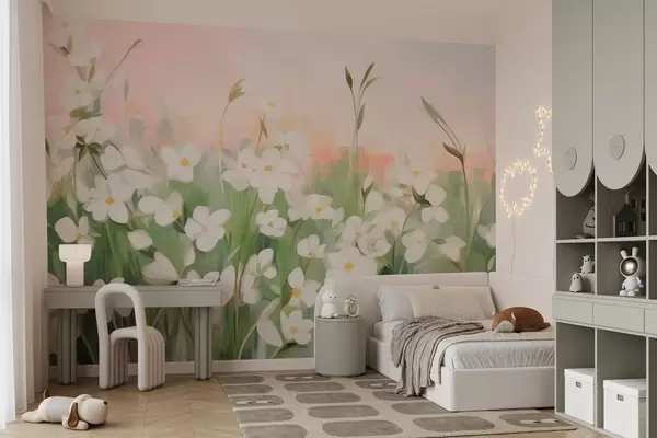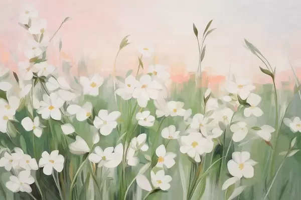 Fototapetai Abstraktus laukinių gėlių laukas su žaliais stiebais ir lapais, prieš švelniai rožinį ir baltą tekstūrinį dangų Nr. w09297