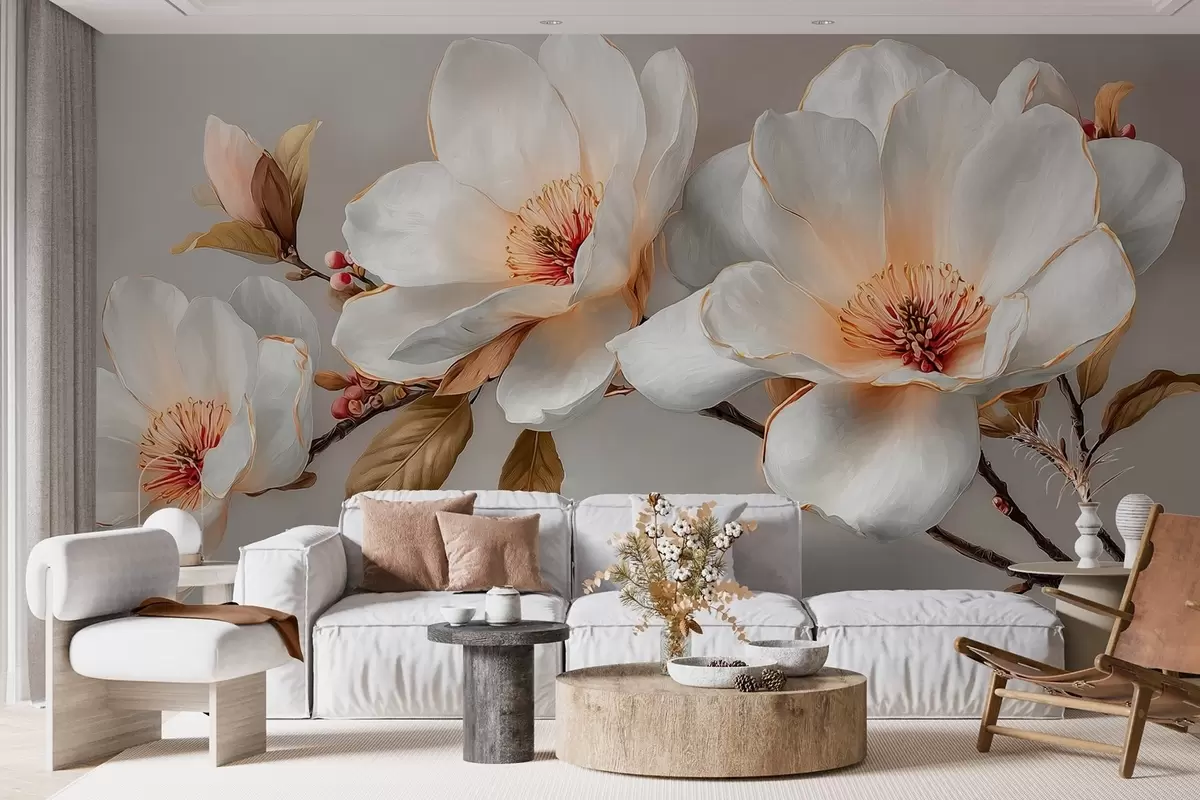 Fototapetai Švelnios pastelinių tonų su oranžiniais centrais gėlės ant šakos Nr. w09299