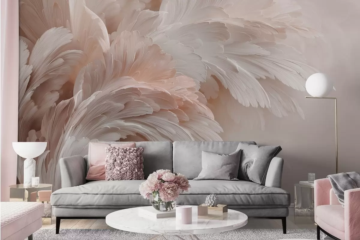 Fototapetai Kreminės rožinės spalvos plunksnos ir žiedlapiai Nr. w09301