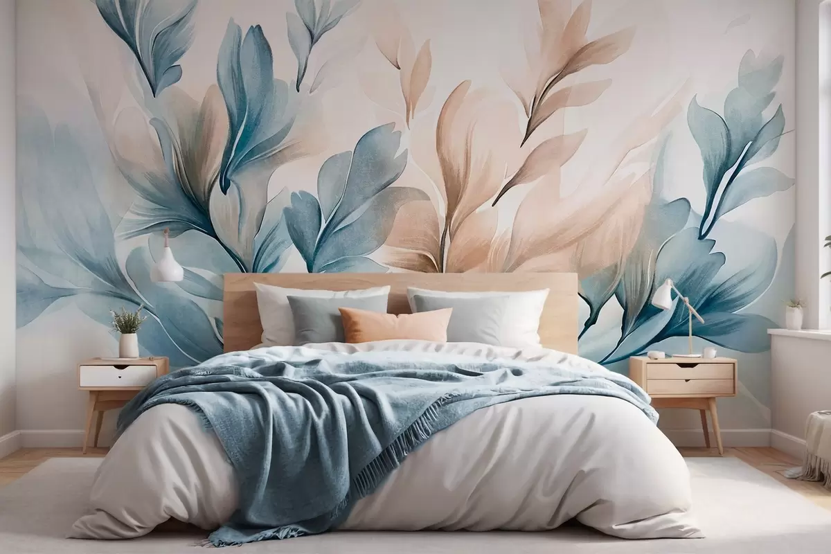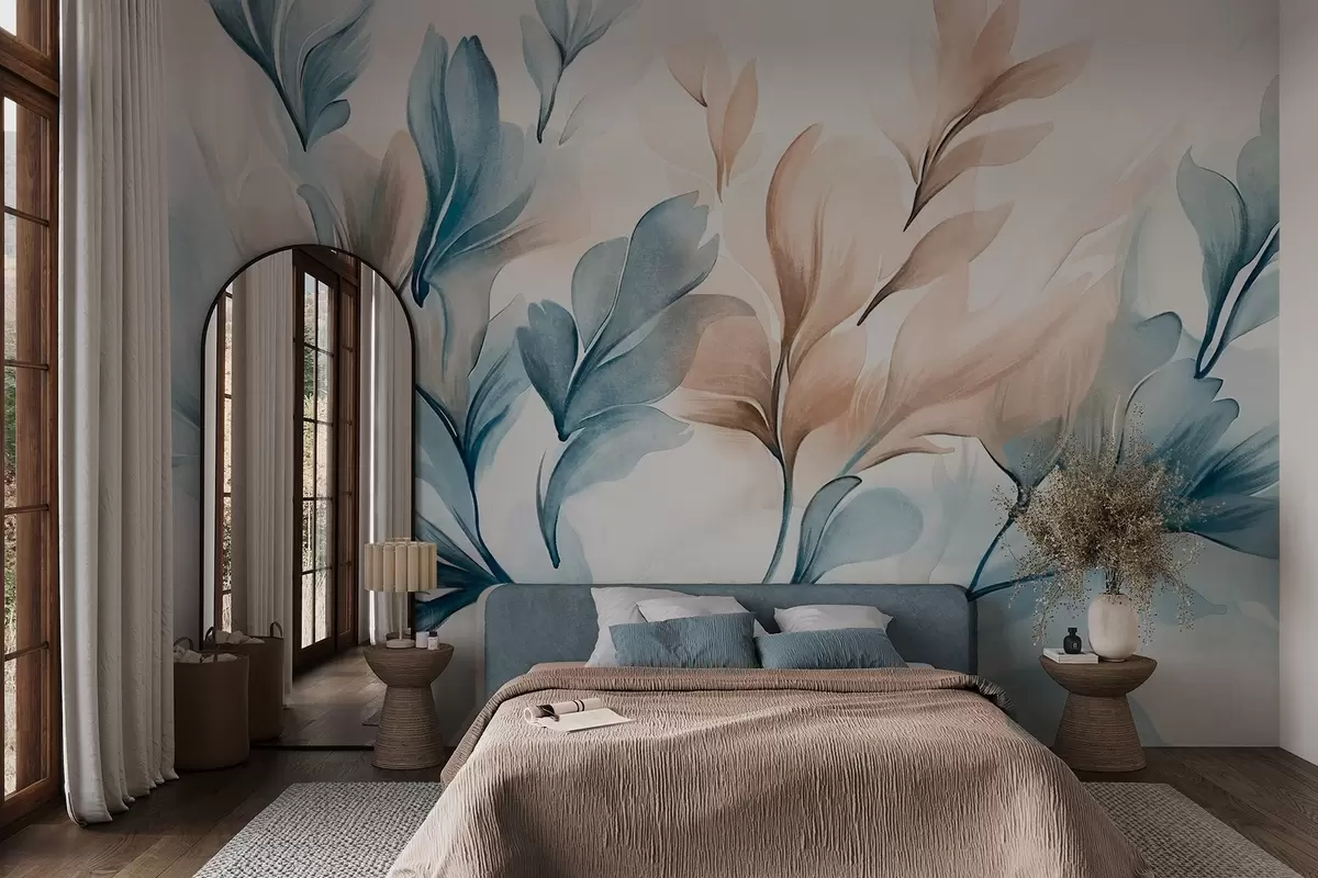 Fototapetai Mėlyni ir rudi abstraktūs lapai su matomais teptuko potėpiais , lengvi ir tekstūruoti, švelni spalvų paletė, akvarelės efektas Nr. w09313
