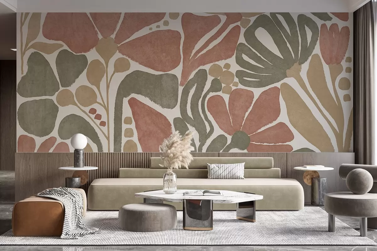 Fototapetai Abstrakčios raudonos, žalios ir smėlio atspalvių gėlės šviesiame fone, plokščias, stilizuotas šiuolaikinis minimalistinis dizainas Nr. w09315