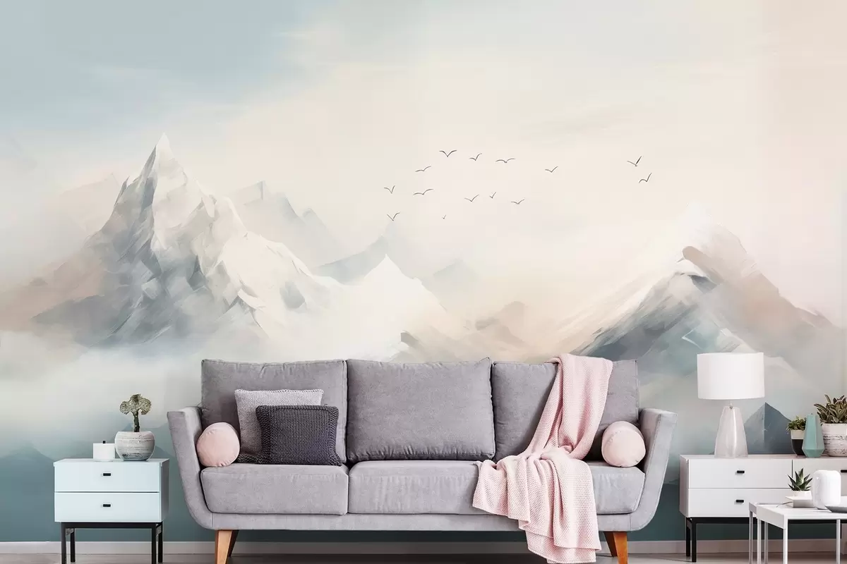 Fototapetai Snieguotos kalnų viršūnės ryto rūke su kylančiais paukščiais Nr. w09326