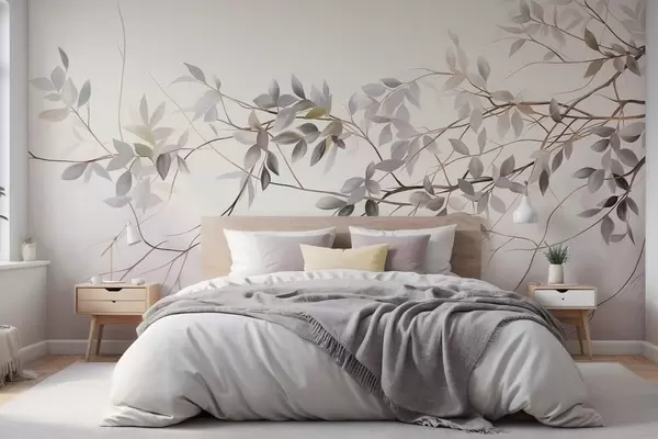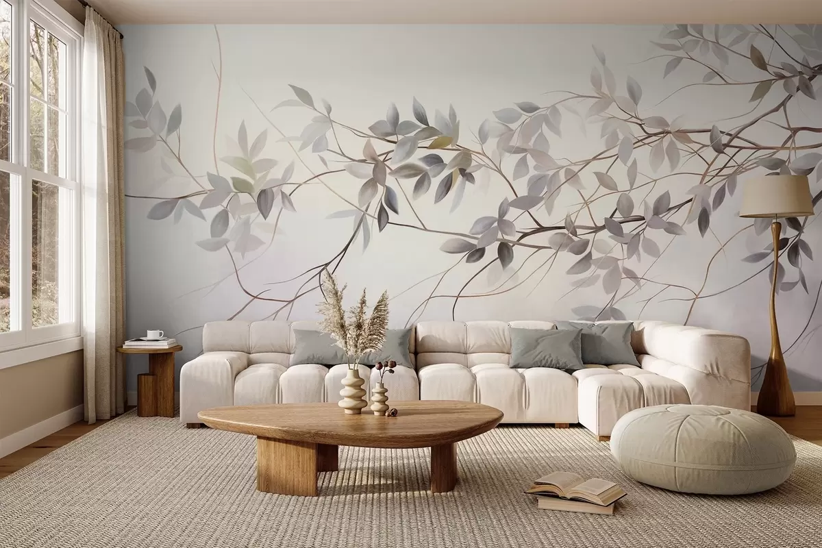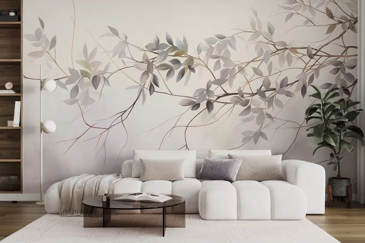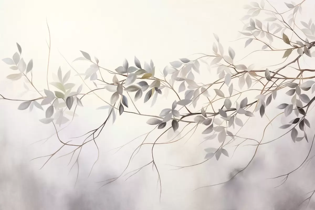 Fototapetai Subtilaus tekstūros šakos su prislopintomis pilkomis, violetinėmis ir žaliomis lapais prieš minkštą, neryškų foną Nr. w09336