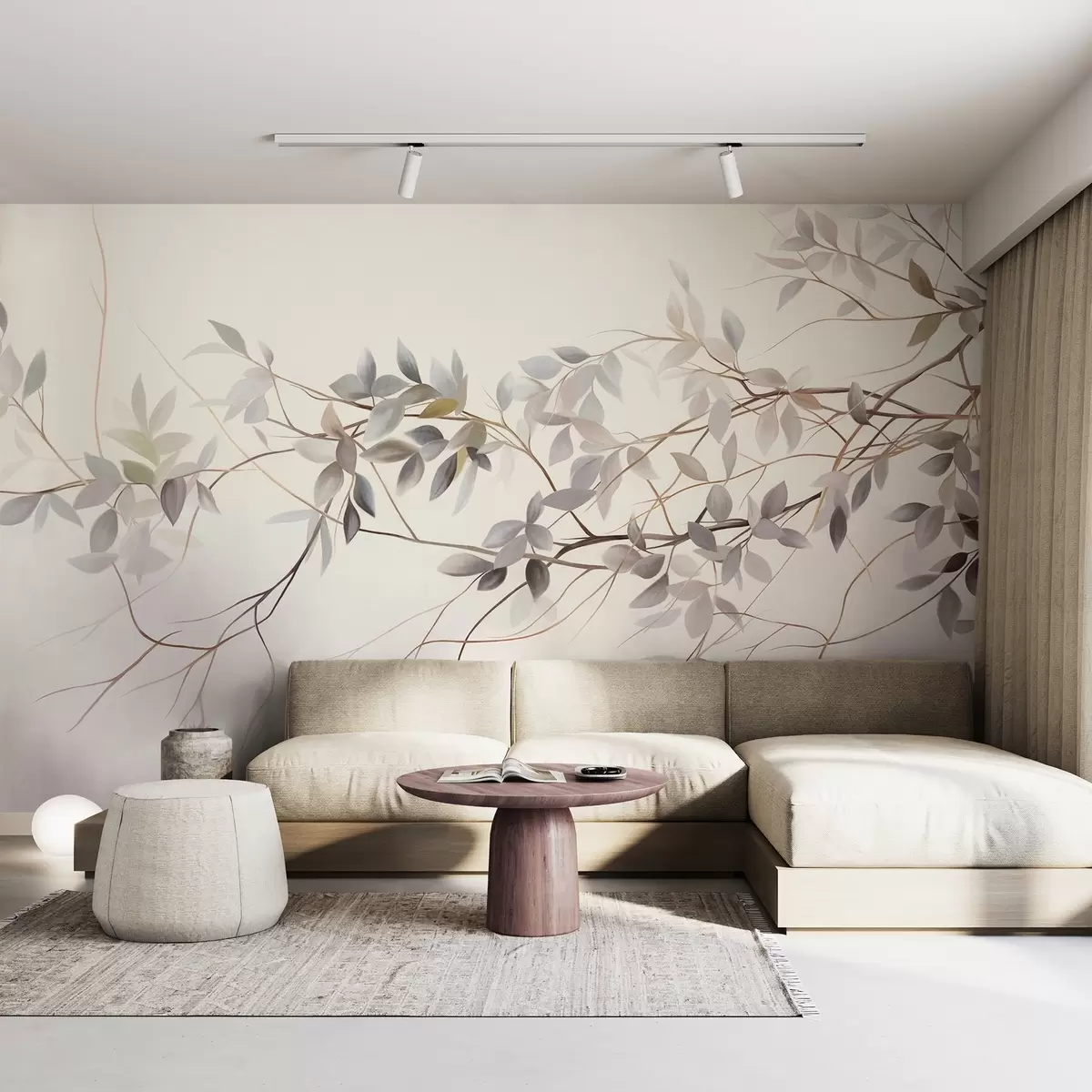 Fototapetai Subtilaus tekstūros šakos su prislopintomis pilkomis, violetinėmis ir žaliomis lapais prieš minkštą, neryškų foną Nr. w09336
