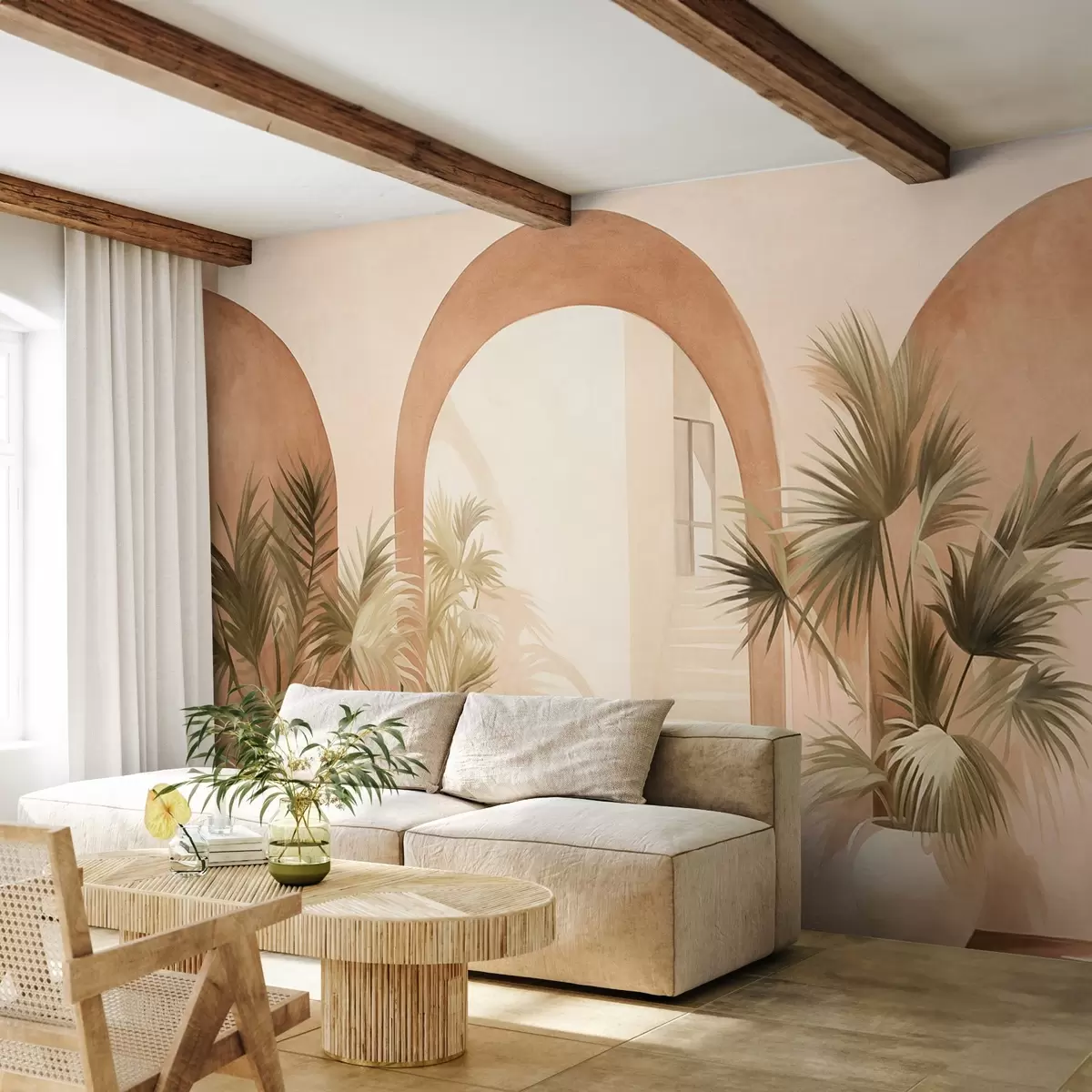 Fototapetai Tekstūrinės arkos su vazoniniais augalais, šviesiai smėlio spalvos, minimalistinis dizainas, laiptai fone w09339