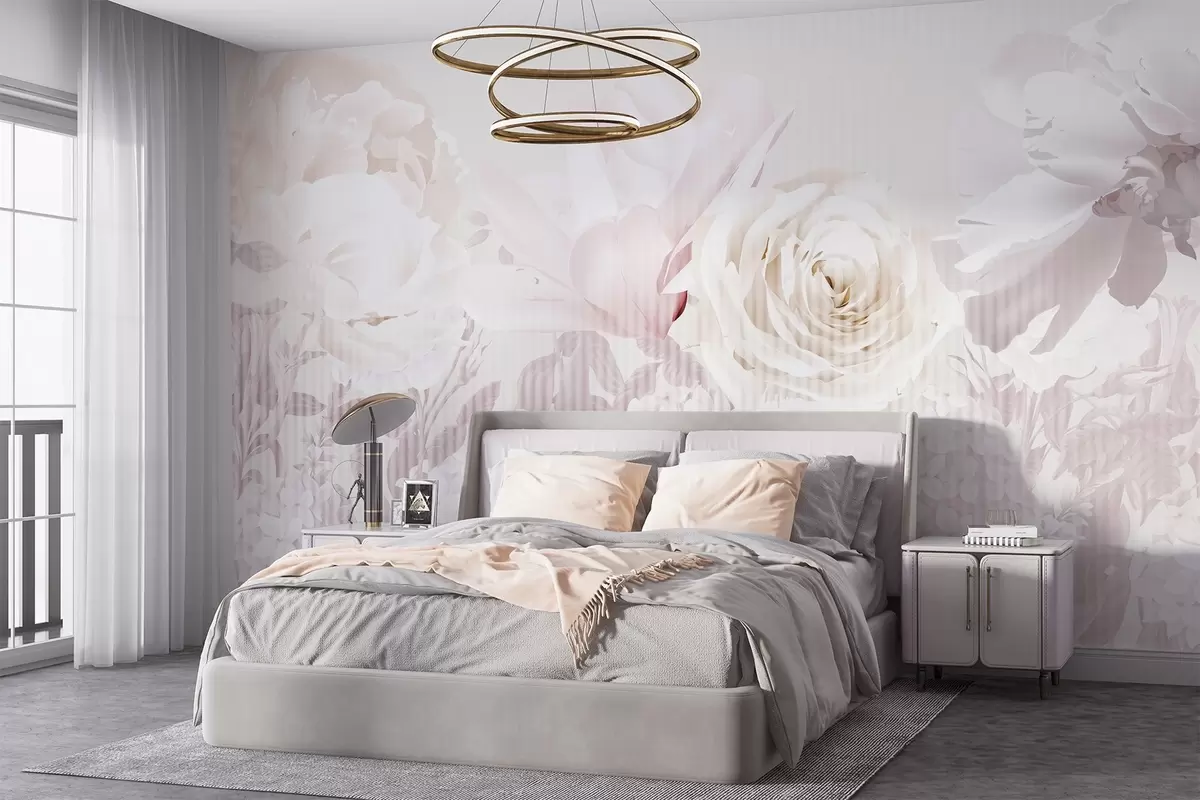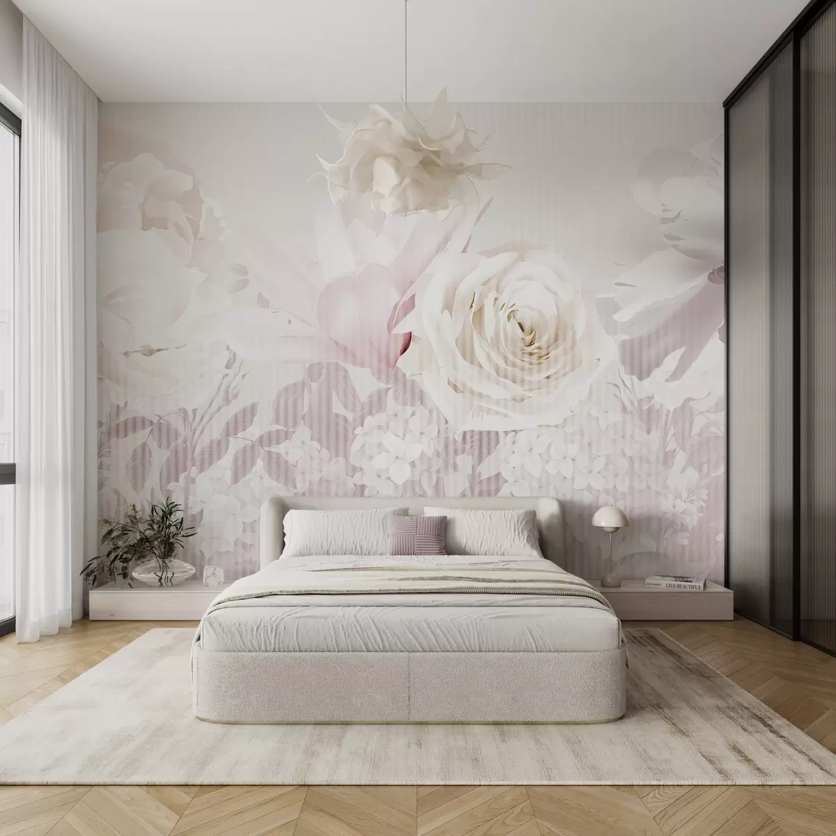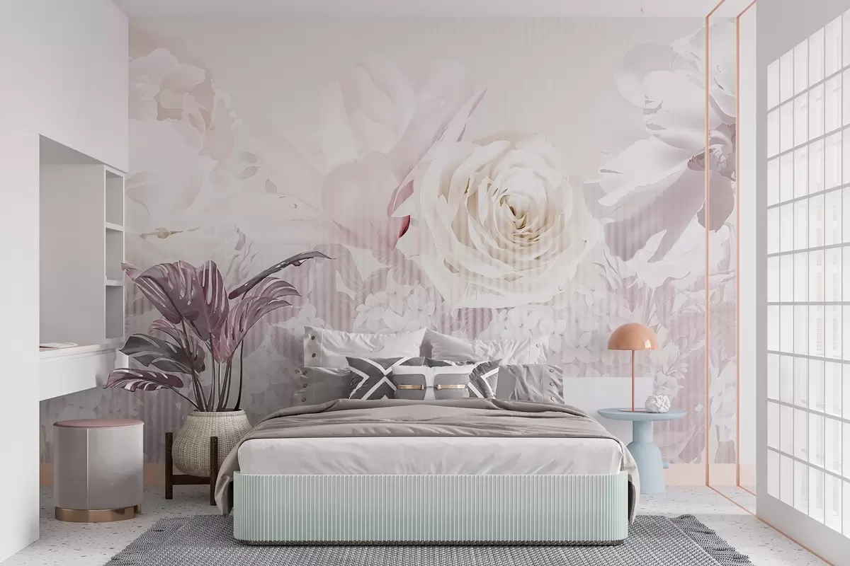 Fototapetai Gėlių kompozicija su švelnių pastelinių atspalvių baltos, rausvos ir smėlio spalvos rožėmis, hortenzijomis ir tulpėmis su dryžuota tekstūra Nr. w09340