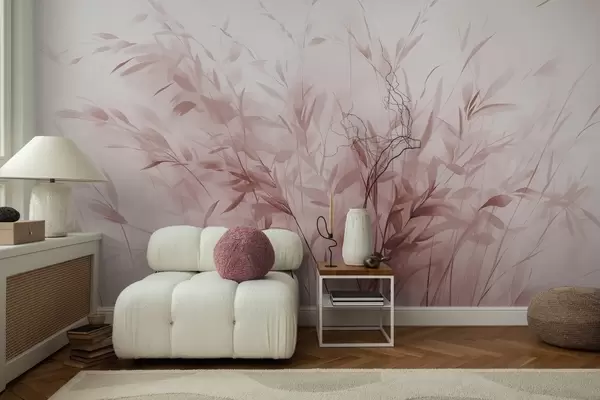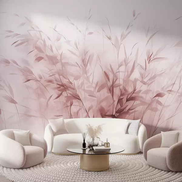 Fototapetai Žolė ir piktžolės su plonais lapeliais ir stiebais, šviesiai rožinės spalvos, švelnūs ir subtilūs teptuko potėpiai, minimalistinis atspaudas Nr. w09342v2