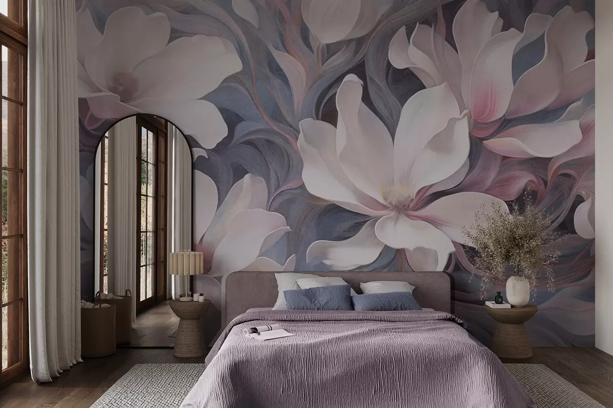 Fototapetai Tekstūrinis paveikslas su baltų magnolijų žiedais ir rausvais akcentais, nutapytas virpančių, prislopintų mėlynų ir pilkų tonų fone Nr. w09344