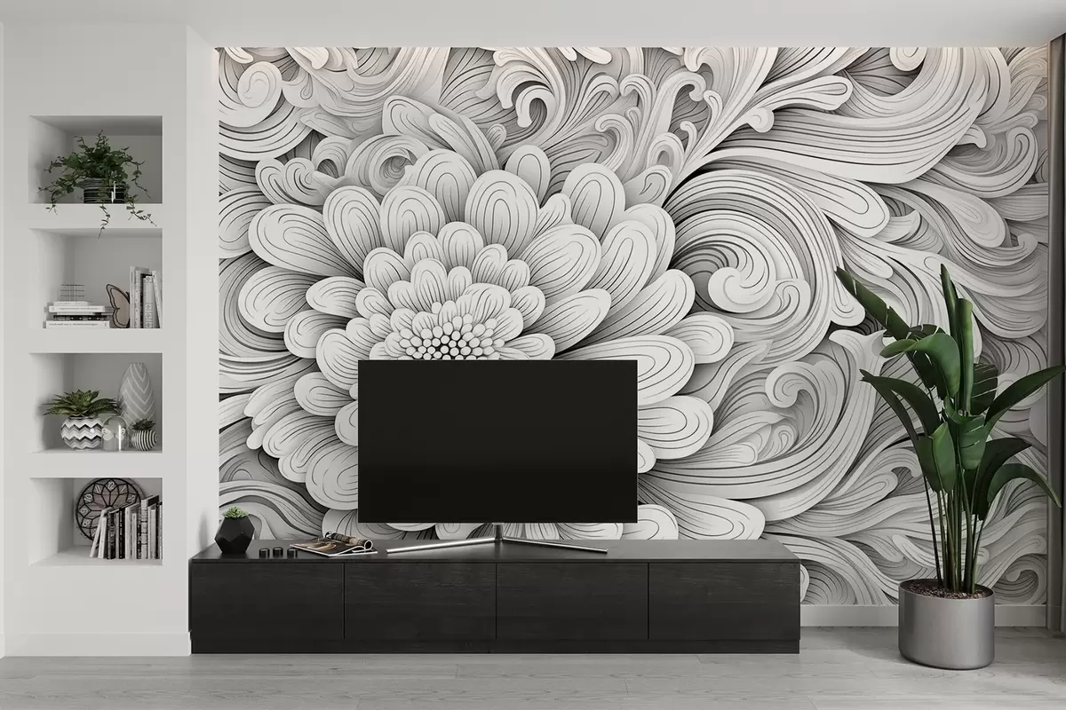 Fototapetai Dekoratyvus juodai baltas gėlės ir sūkurių raštas Nr. w09355