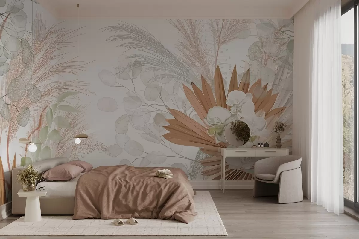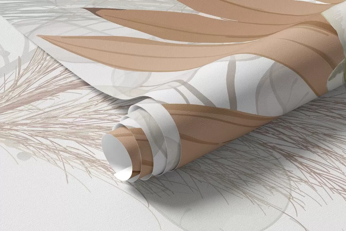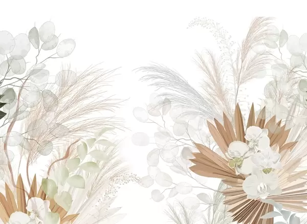 Fototapetai Pampų žolė, eukaliptas, tropiniai lapai ir orchidėjos balto fono, pastelinės spalvos Nr. w09366