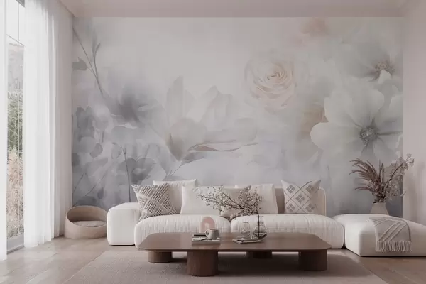 Fototapetai Švelni abstrakti gėlių kompozicija su pastelinėmis rožinėmis rožėmis ir magnolijomis, švelnus fokusas, šviesiai pilkas fonas Nr. w09371
