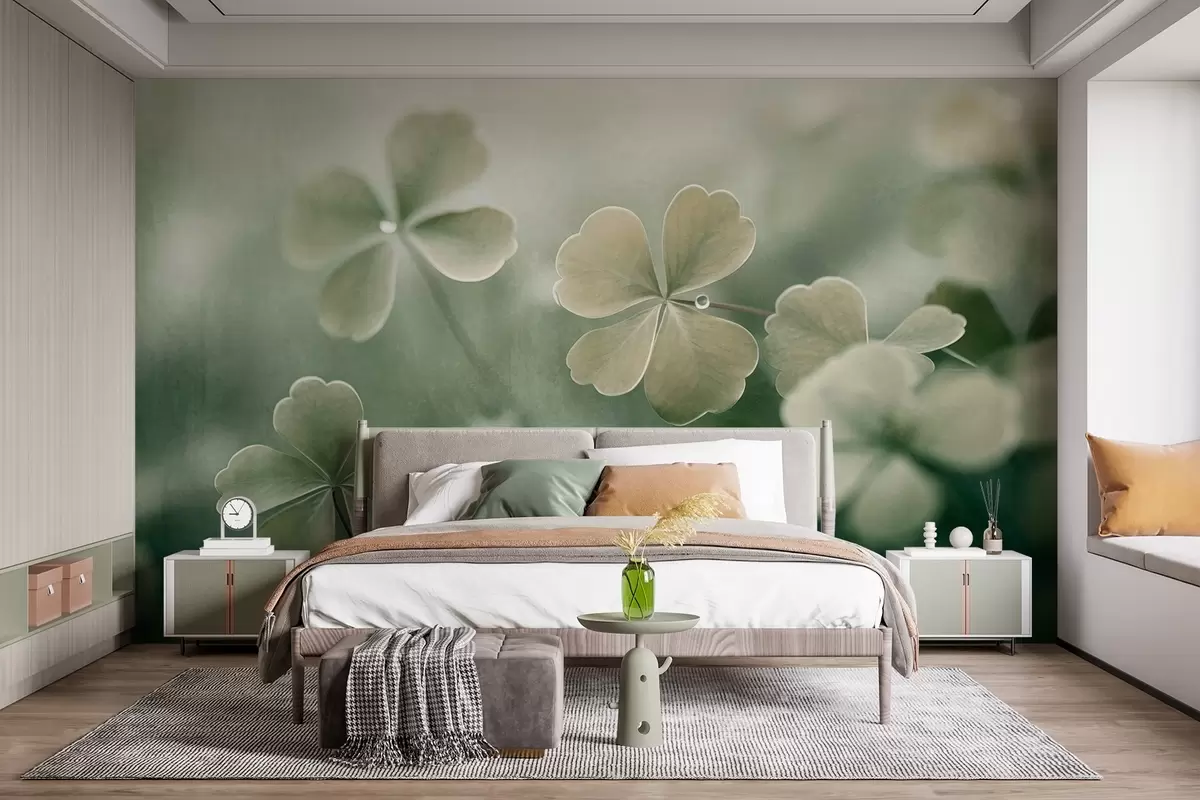 Fototapetai Keturių lapų dobilai su vandens lašais, šviesiai žalia spalva, minkštas fokusavimas, neryškus fonas, tekstūrinis atspaudas Nr. w09376