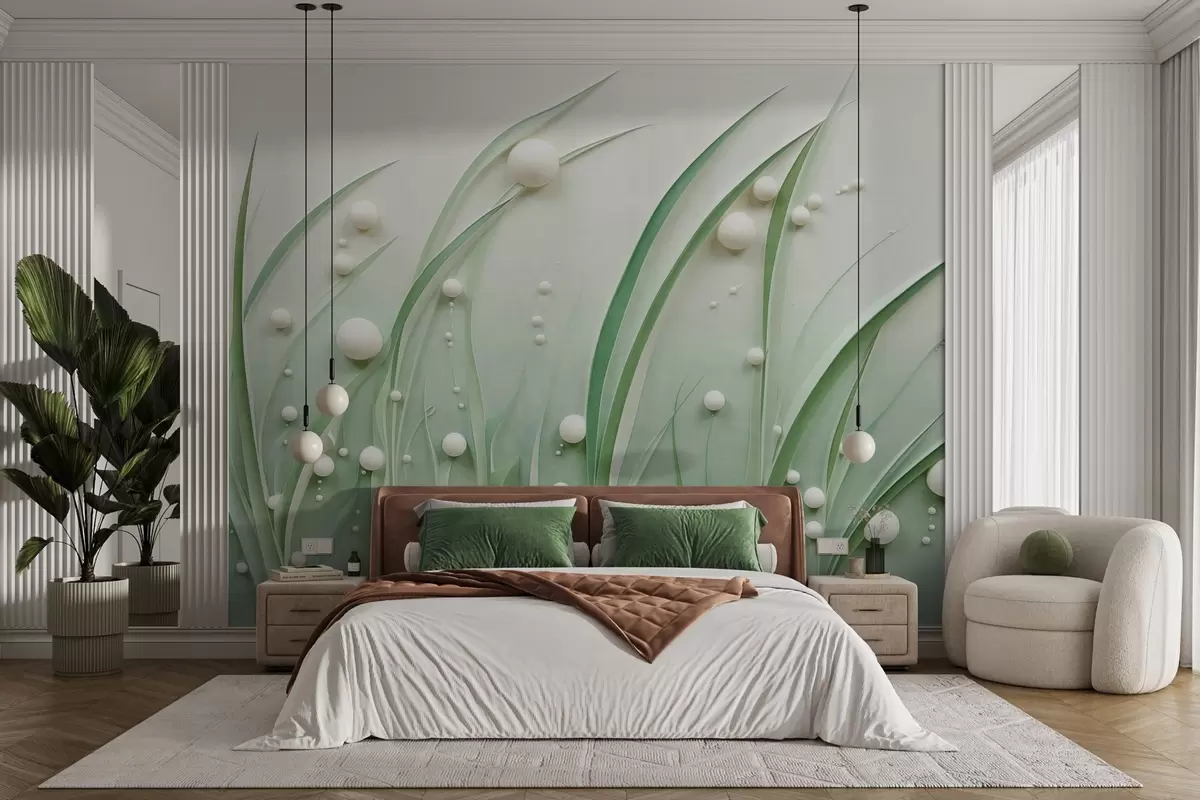 Fototapetai Abstrakti žalia žolė su baltais rutuliukais, šviesiai žalias fonas, tekstūra, švarios linijos, minimalistinis stilius Nr. w09382