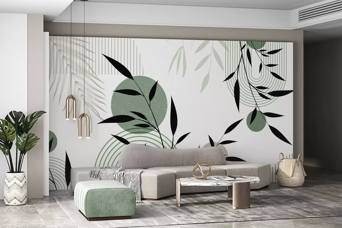 Fototapetai Tekstūrinis abstraktus raštas su geometrinėmis figūromis, apskritimais ir arkomis bei juodais ir žaliais augalais baltame fone Nr. w09384