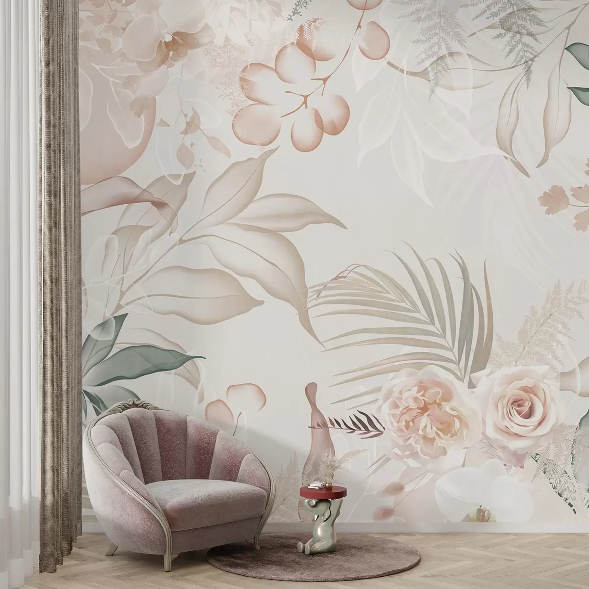 Fototapetai Gėlių kompozicija su rožėmis, orchidėjomis, eukaliptais ir palmių lapais pastelinėmis spalvomis, smėlio spalvos fonas Nr. w09393