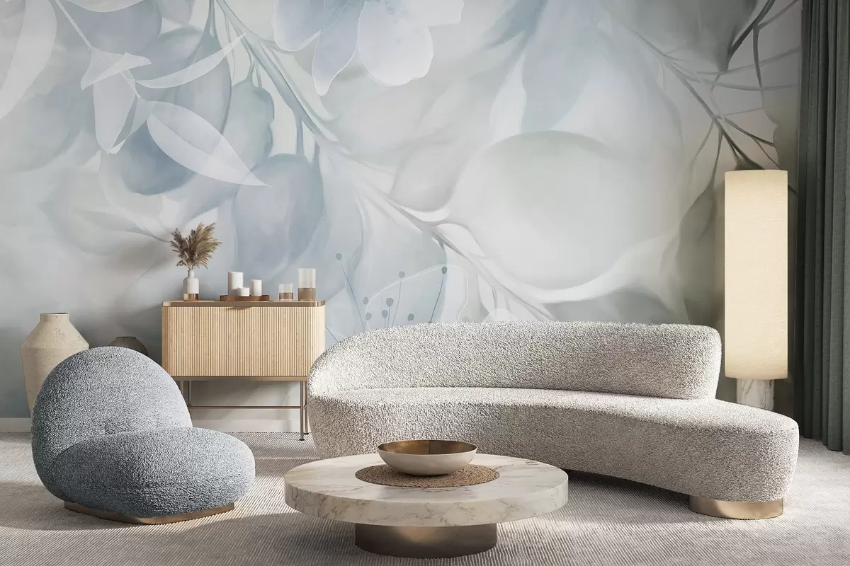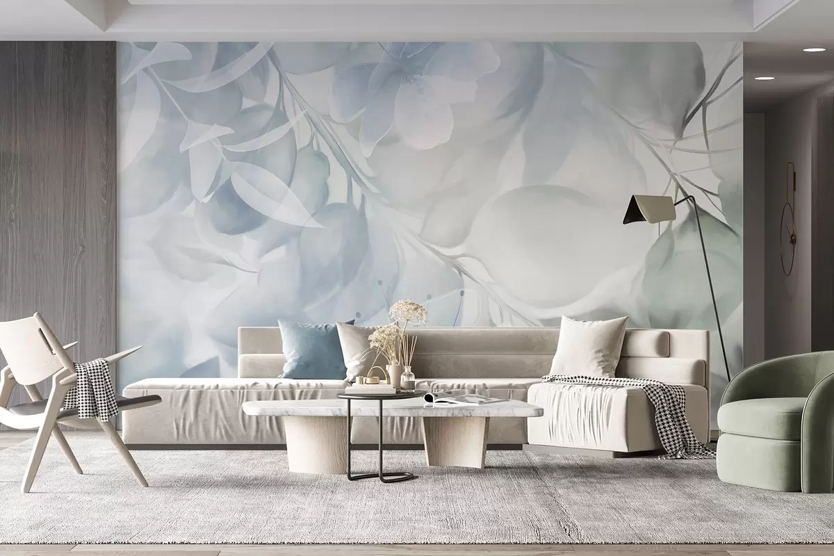 Fototapetai Gėlių menas su prislopintomis mėlynomis ir žaliomis gėlėmis, lapais ir šakomis, švelniomis pastelinėmis spalvomis, akvarelės tekstūros efektu Nr. w09397v1