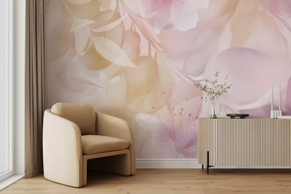 Fototapetai Gėlių menas su prislopintomis geltonomis ir violetinėmis gėlėmis, lapais ir šakomis, švelniomis pastelinėmis spalvomis, akvarelės tekstūros efektu Nr. w09397v2