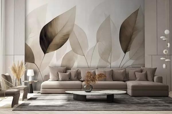 Fototapetai Tekstūruotas tapybos imitacija lapų atspalvių rudos ir smėlio spalvos su subtiliais gyslomis ir stiebais Nr. w09400v1