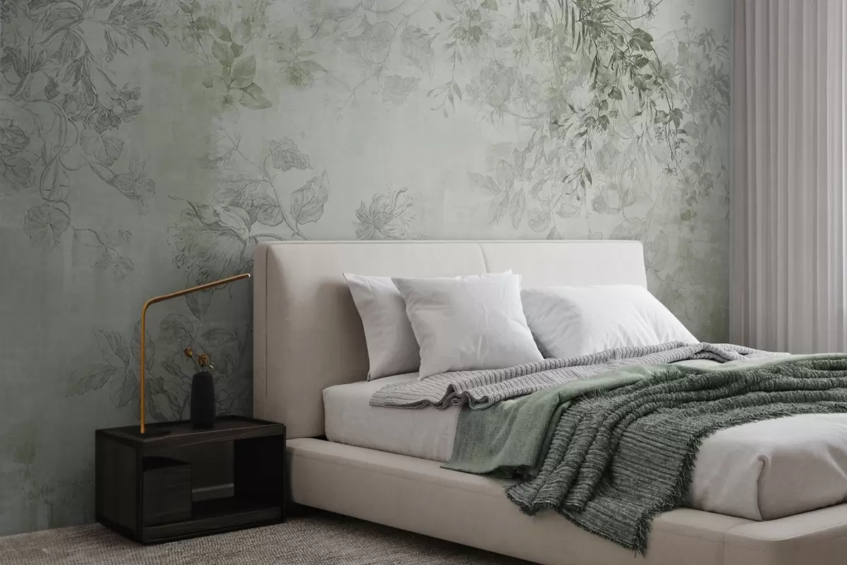 Fototapetai Vintage tekstūrinis gėlių menas su piešimo stiliaus subtiliais sodo gėlių ir lapų iliustracijomis, švelniais žaliais atspalviais Nr. w09402v2