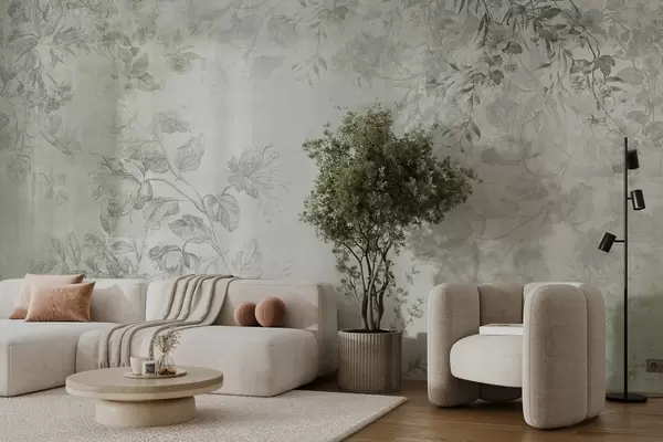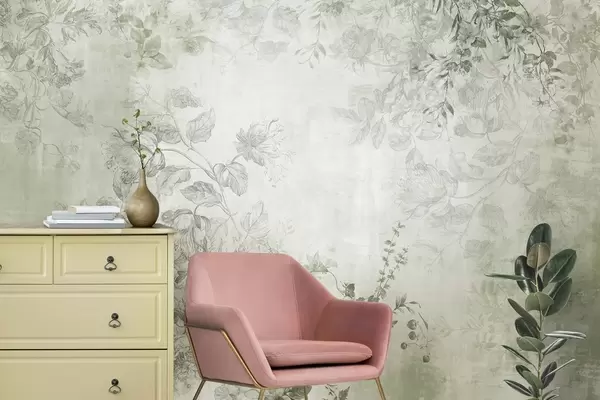 Fototapetai Vintage tekstūrinis gėlių menas su piešimo stiliaus subtiliais sodo gėlių ir lapų iliustracijomis, švelniais žaliais atspalviais Nr. w09402v2