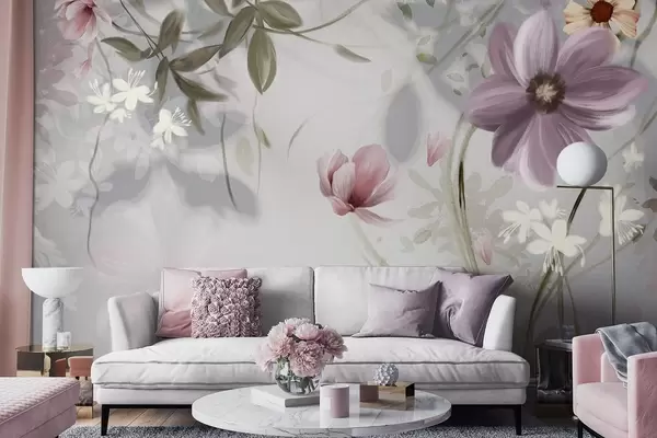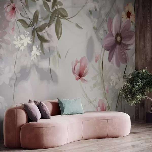 Fototapetai Rožinės ir baltos gėlės su žaliais stiebais ir lapais, švelnus apšvietimas, prislopintos spalvos, gėlių kompozicija Nr. w09417v1