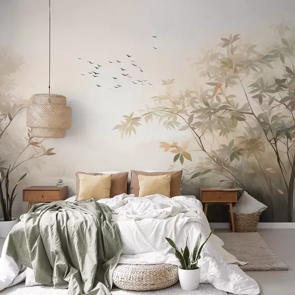 Fototapetai Tekstūruotas peizažas su medžiais ir paukščių pulku, skrendančiu danguje, pastelinės spalvos, gamtos vaizdas Nr. w09418