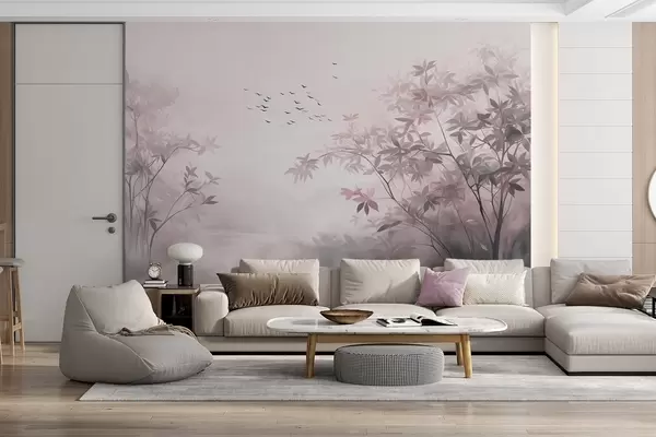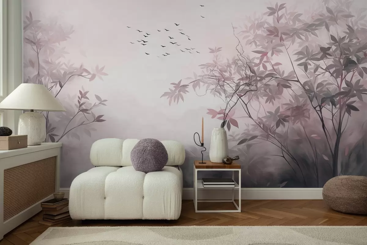 Fototapetai Tekstūruotas peizažas su medžiais ir paukščių pulku, skrendančiu danguje, pastelinės spalvos, gamtos vaizdas Nr. w09418v1