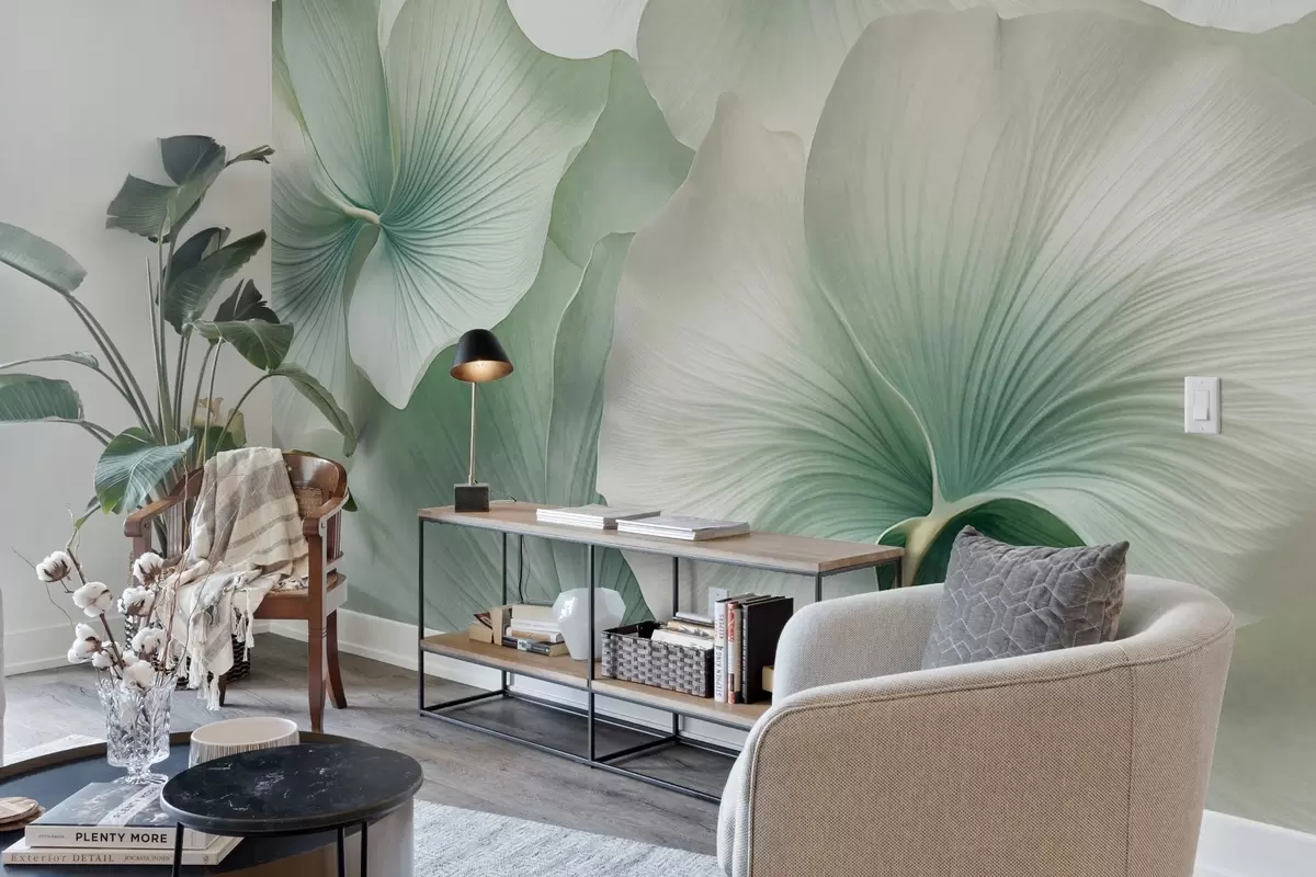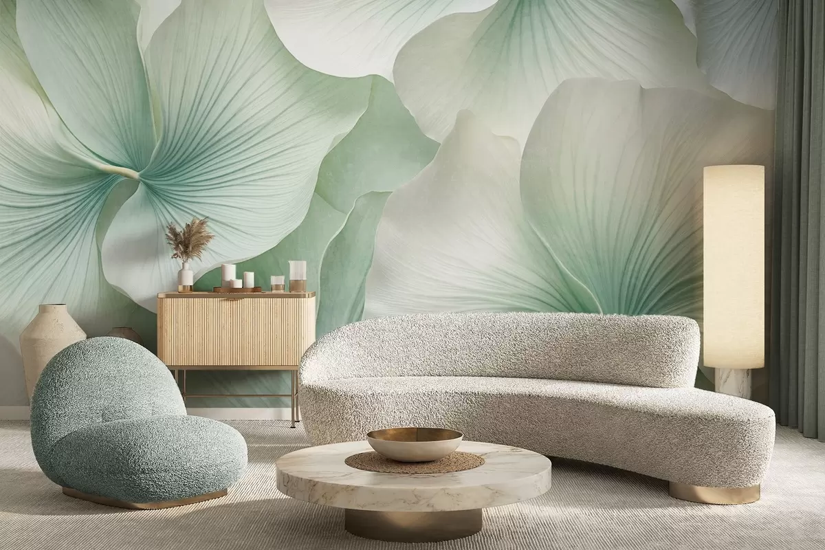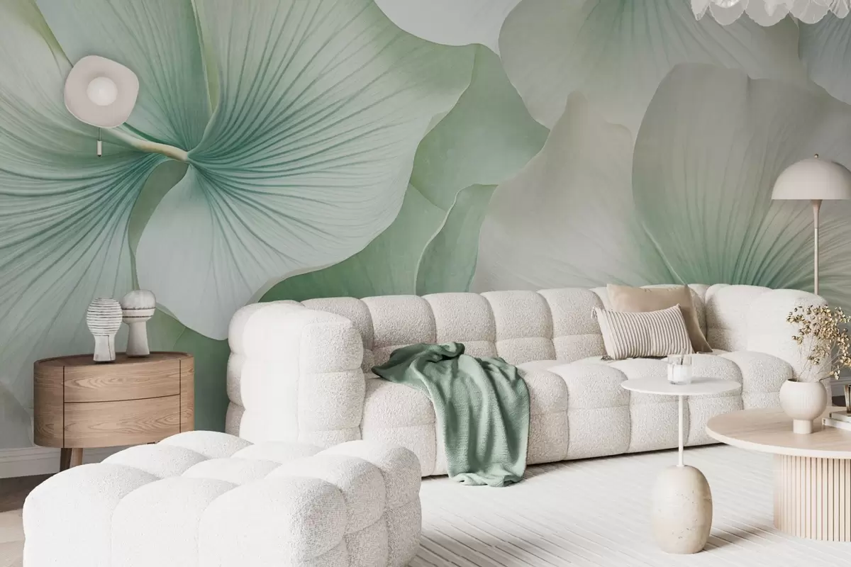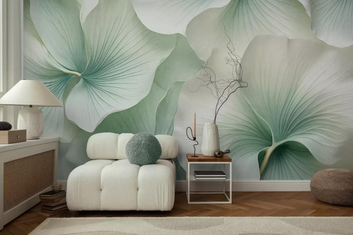 Fototapetai Balta ir žalia ginkgo lapai, minkšta tekstūra, abstraktus gėlių fonas, minimalistinis modernus stilius Nr. w09421