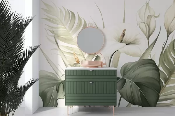 Fototapetai Balta kalė ir žali tropiniai lapai, botaninė iliustracija, šviesus fonas, vintage stilius, tekstūruotas Nr. w09423