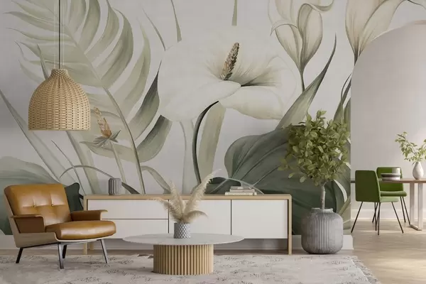 Fototapetai Balta kalė ir žali tropiniai lapai, botaninė iliustracija, šviesus fonas, vintage stilius, tekstūruotas Nr. w09423