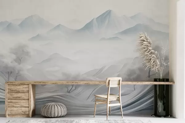 Fototapetai Snieguotas abstraktus dekoratyvinis kalnų peizažas su baltais medžiais ir rūku, minimalistinis tekstūrinis stilius Nr. w09426