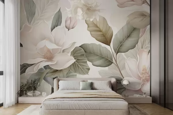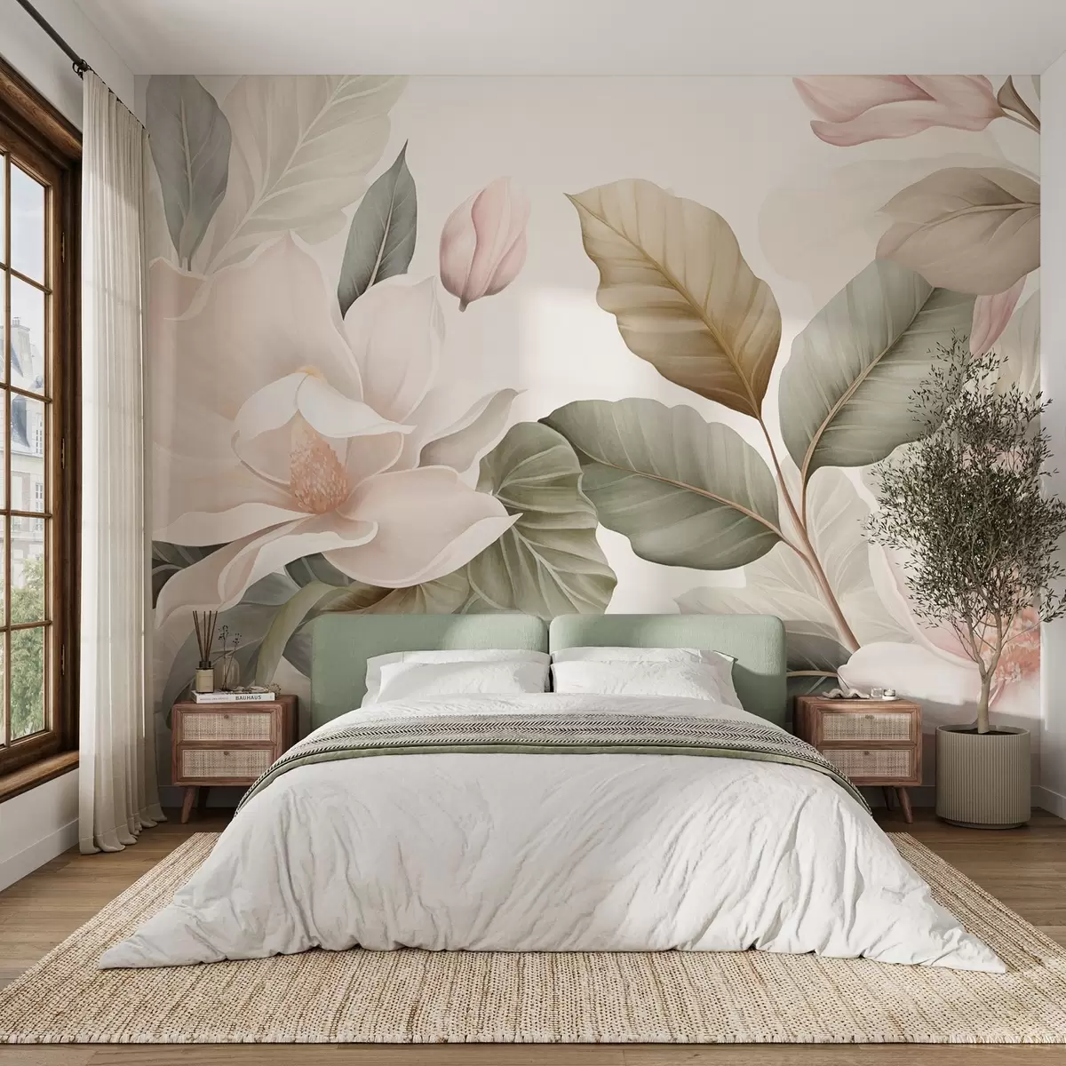 Fototapetai Magnolijos žiedai su pastelinės spalvos, baltos, rožinės ir žalios spalvos lapais, švelnūs, subtilūs, akvarelės stiliaus Nr. w09427