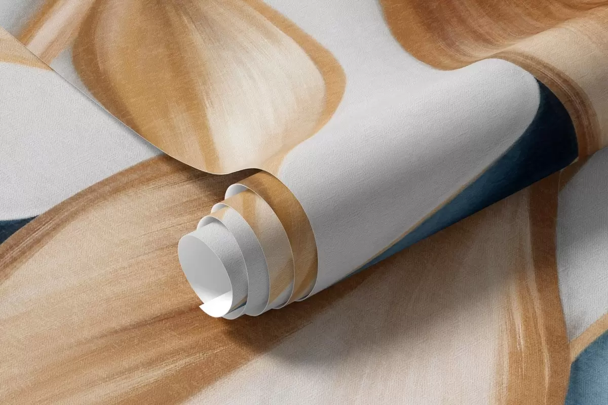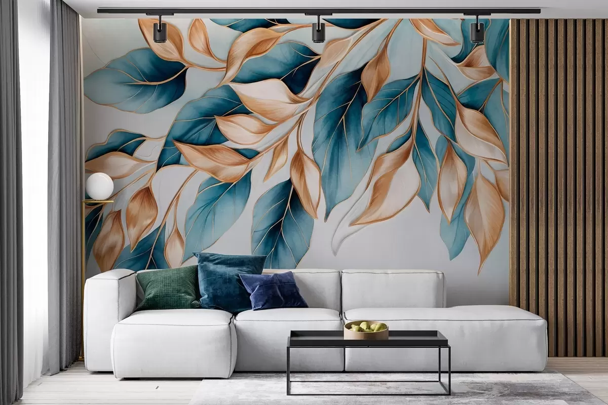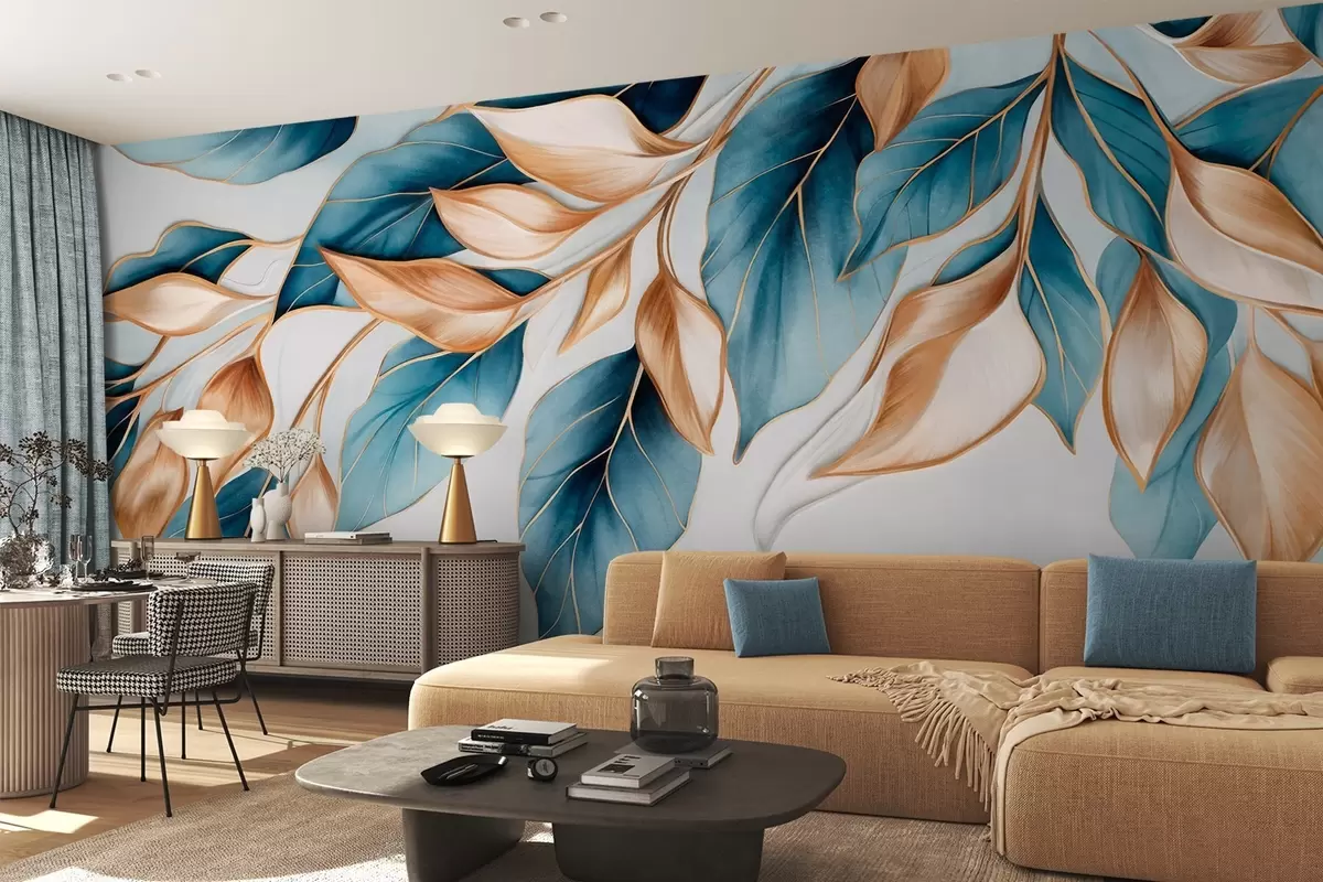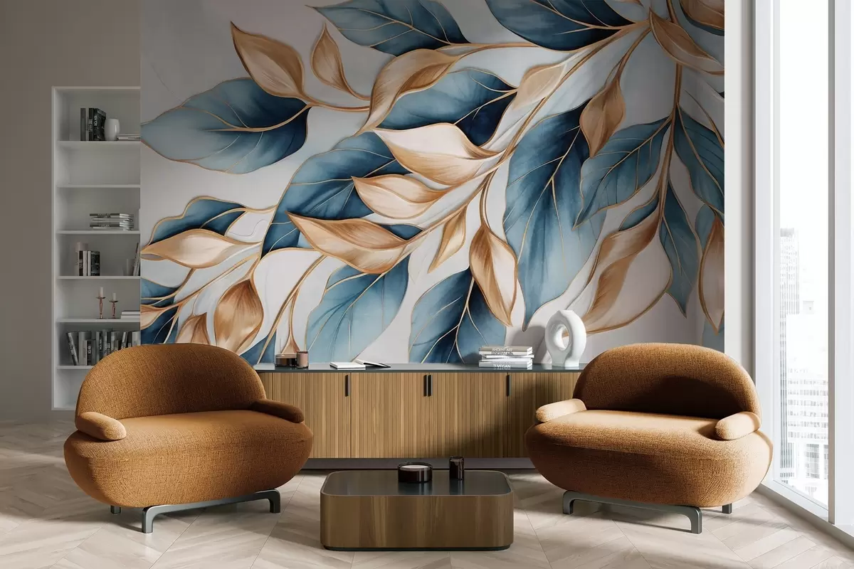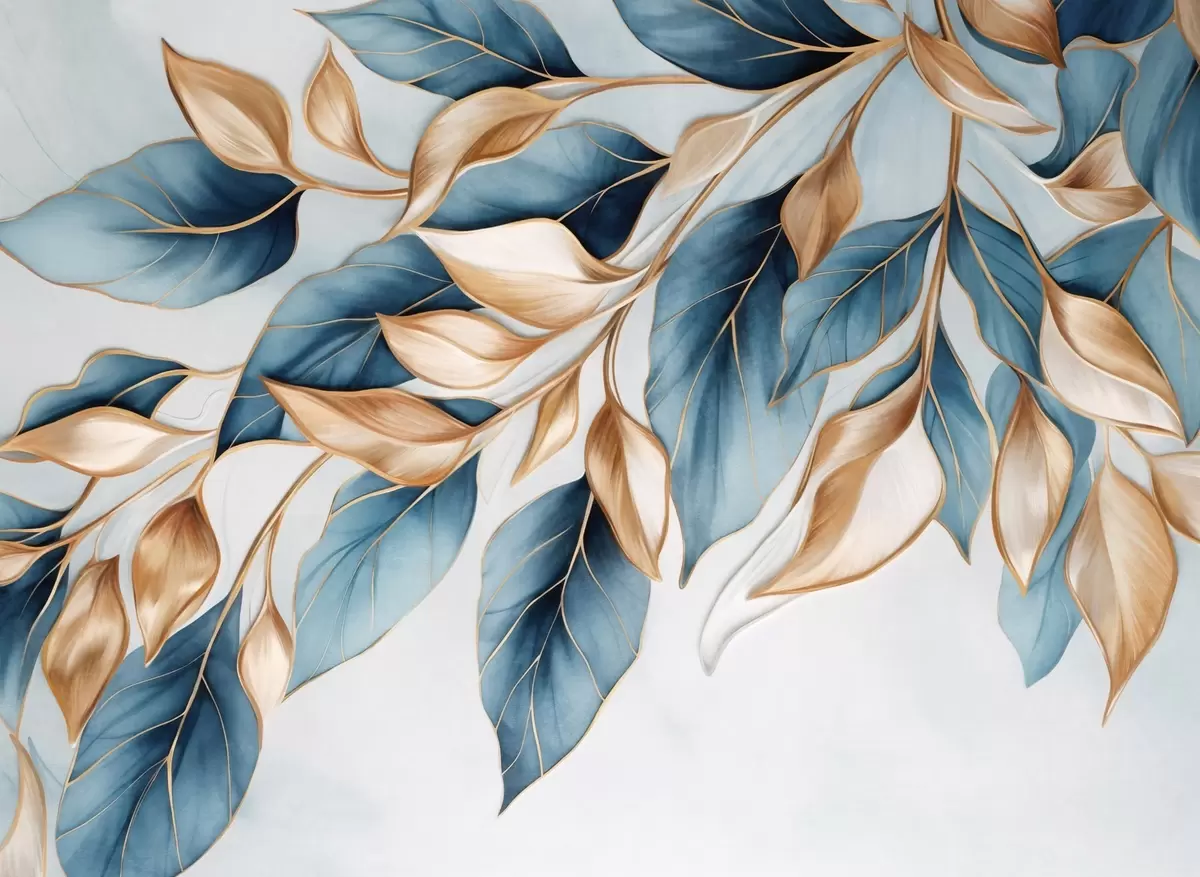 Fototapetai Tekstūruoti mėlyni ir oranžiniai lapai, šviesiai mėlynas fonas, elegantiškas ir meniškas dizainas, modernus stilius Nr. w09429