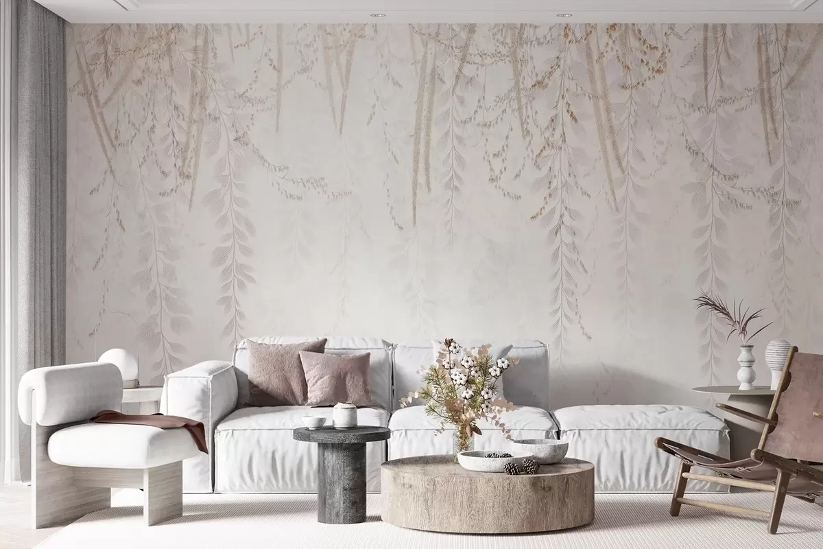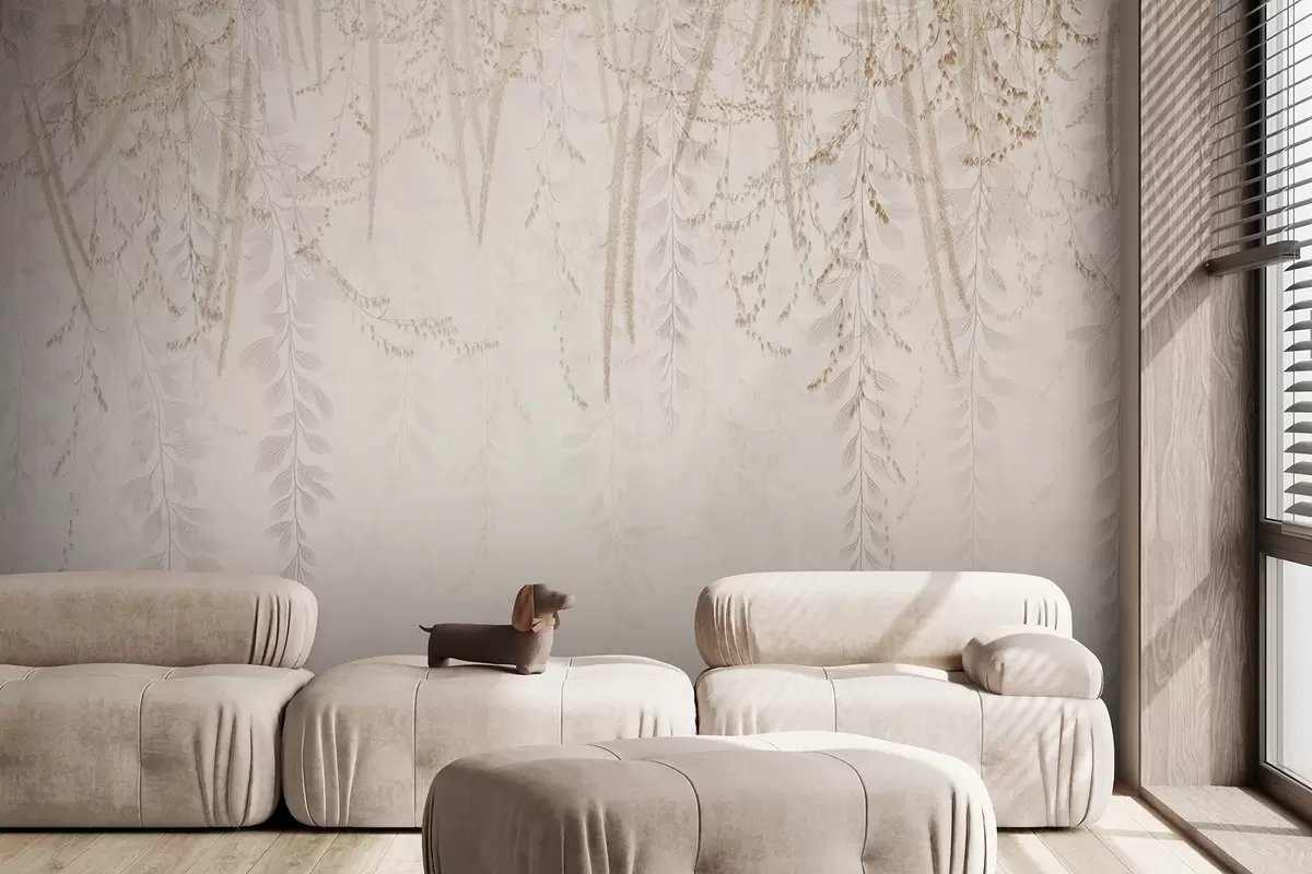 Fototapetai Šviesūs kabantys lapai ir šakos smėlio atspalvių Nr. w09433