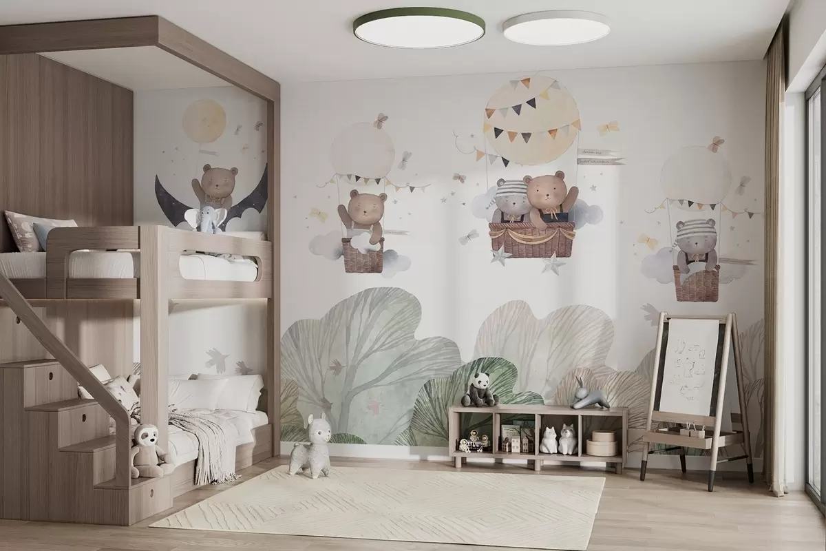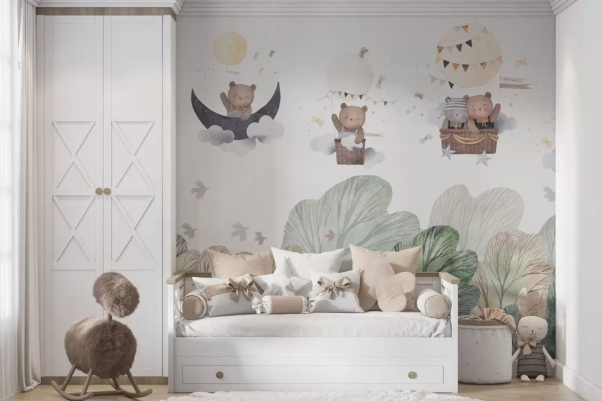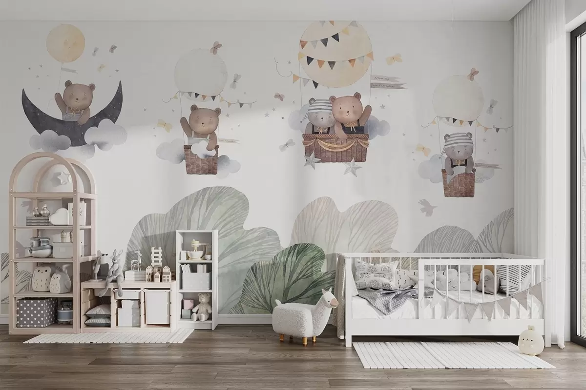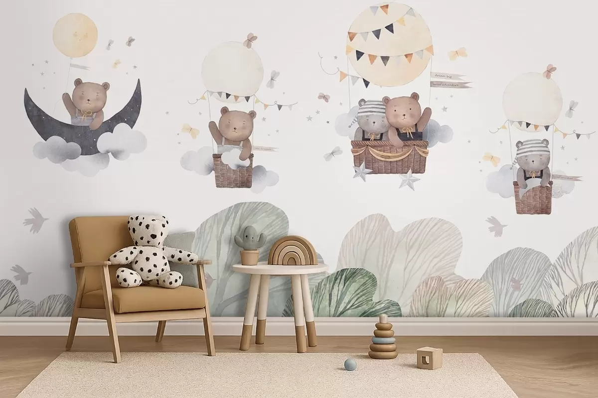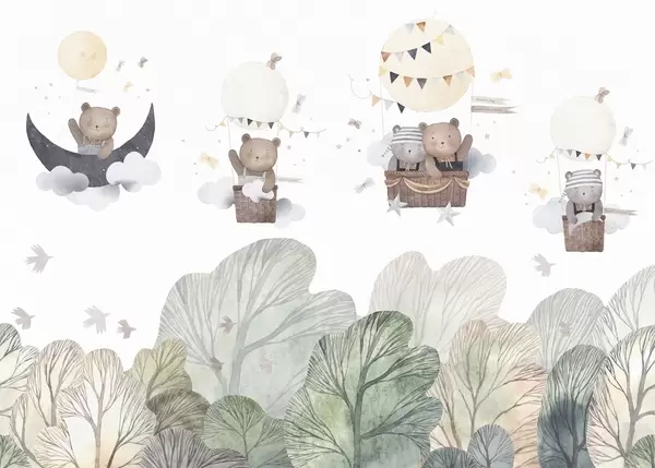 Fototapetai Akrilo dažais tapyti balionai su meškomis virš miško Nr. w09437