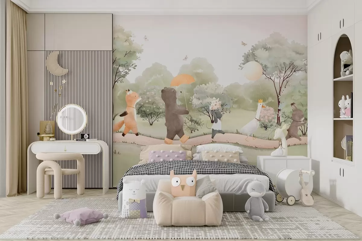 Fototapetai Šventinė mažų gyvūnėlių kelionė per mišką akvarelės stiliumi Nr. w09440