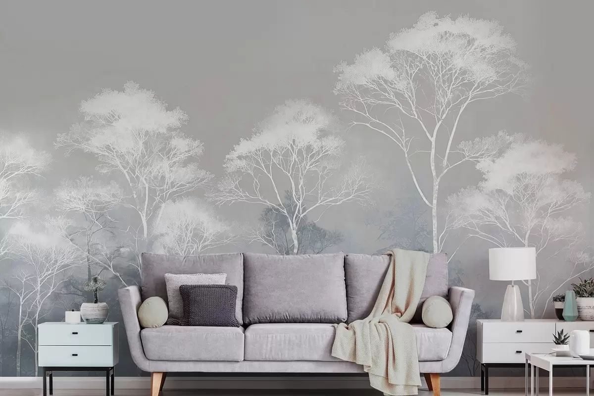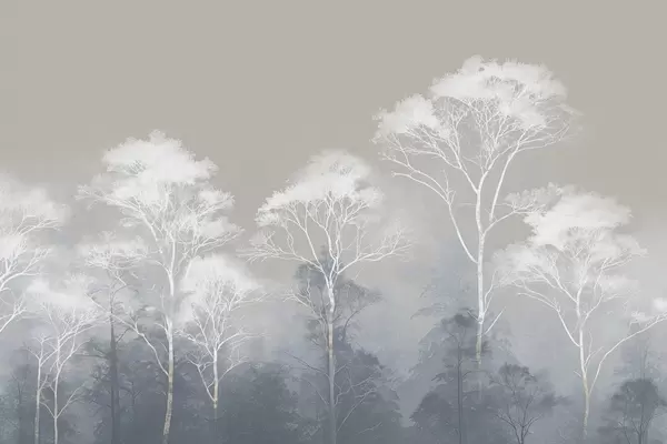 Fototapetai Minimalistinės medžių kompozicijos mėlynai pilkos spalvos paletėje, rūke Nr. w09448