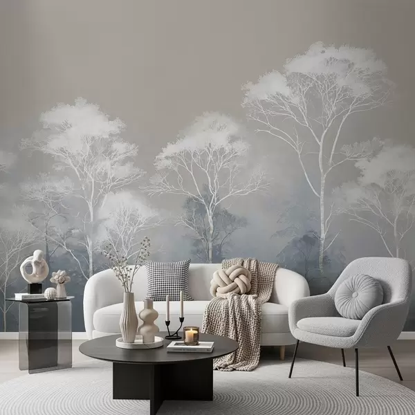 Fototapetai Minimalistinės medžių kompozicijos mėlynai pilkos spalvos paletėje, rūke Nr. w09448